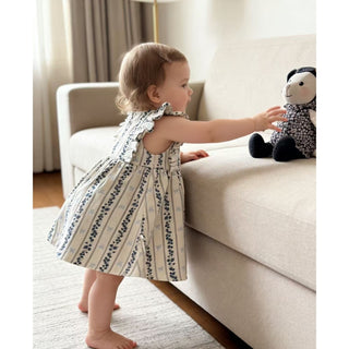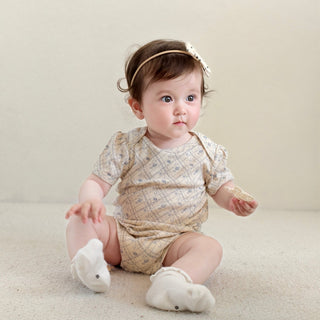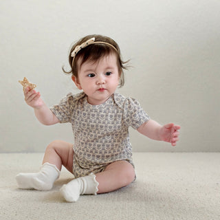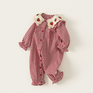 生後1ヶ月/身長56cm/体重5kgの娘。サイズ60でぴったりでした。デザインに一目惚れをしたのと、夏生まれで普段肌着で生活している娘の初めてのお洋服は綿100%がいいなと思い、こちらの商品を購入しました!想像通りの可愛いお洋服で、周りからも褒められます!何度か洗濯しましたが、生地がしっかりしているので何も問題ないです。