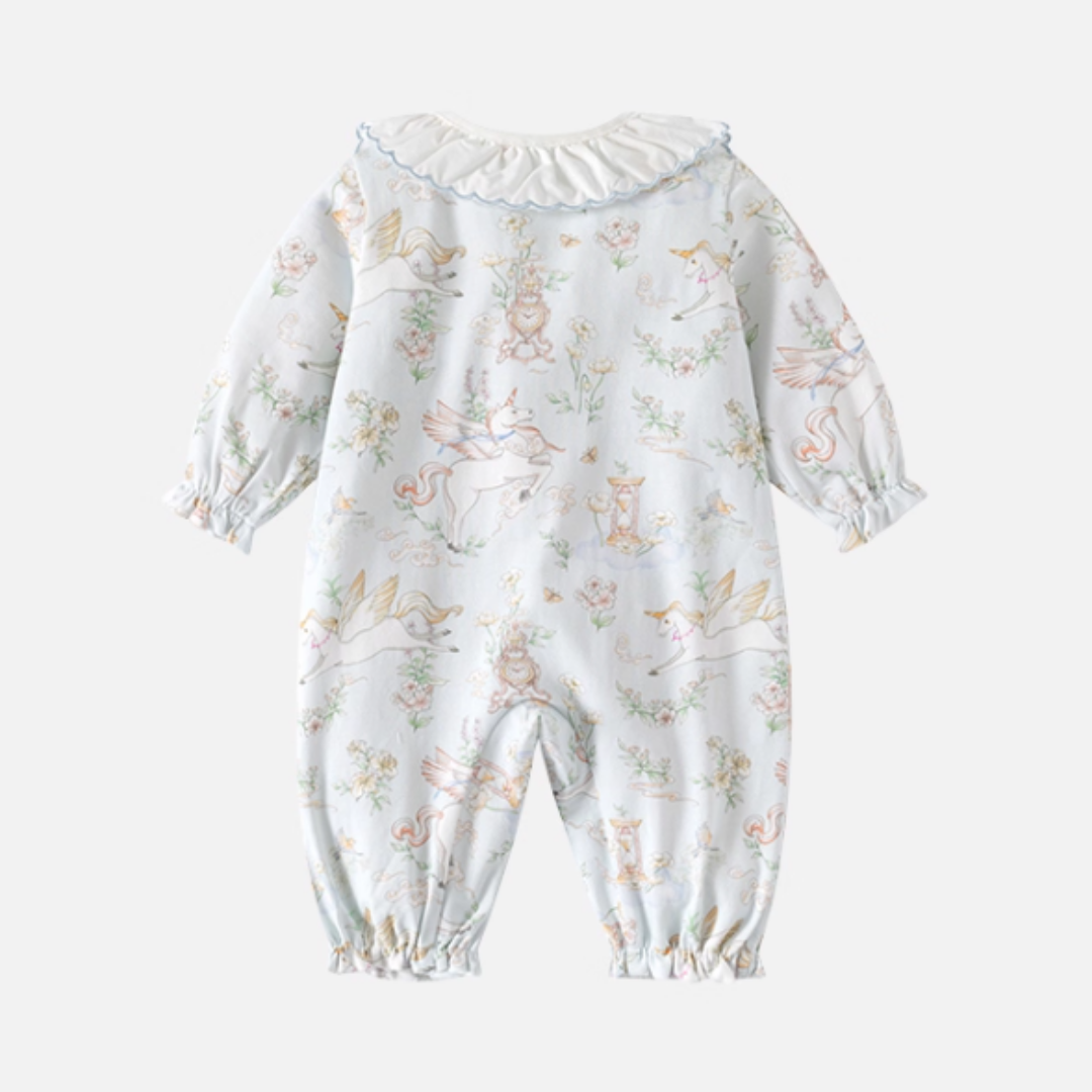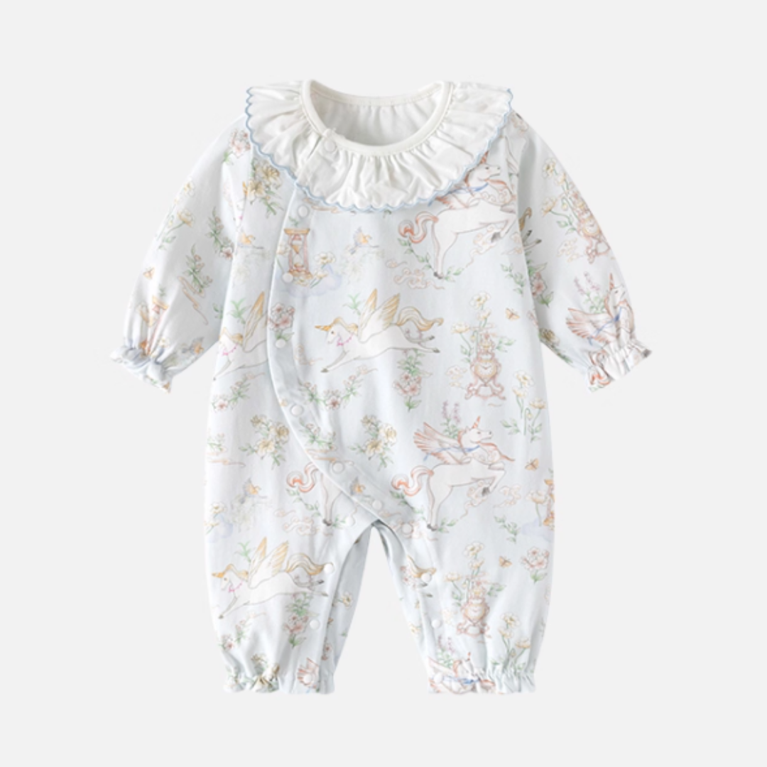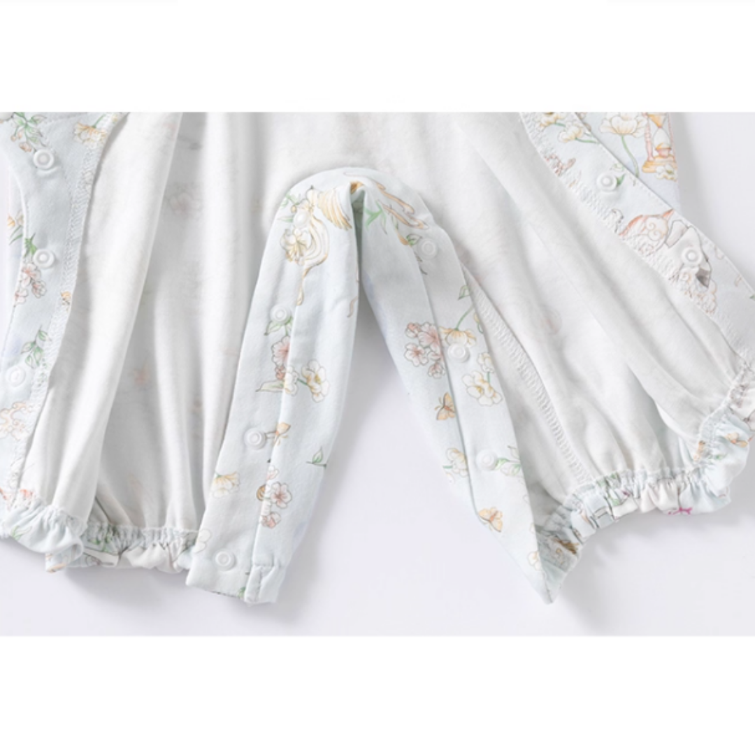くしゅっとした袖と襟が特徴的な特別なデザインのロンパース。