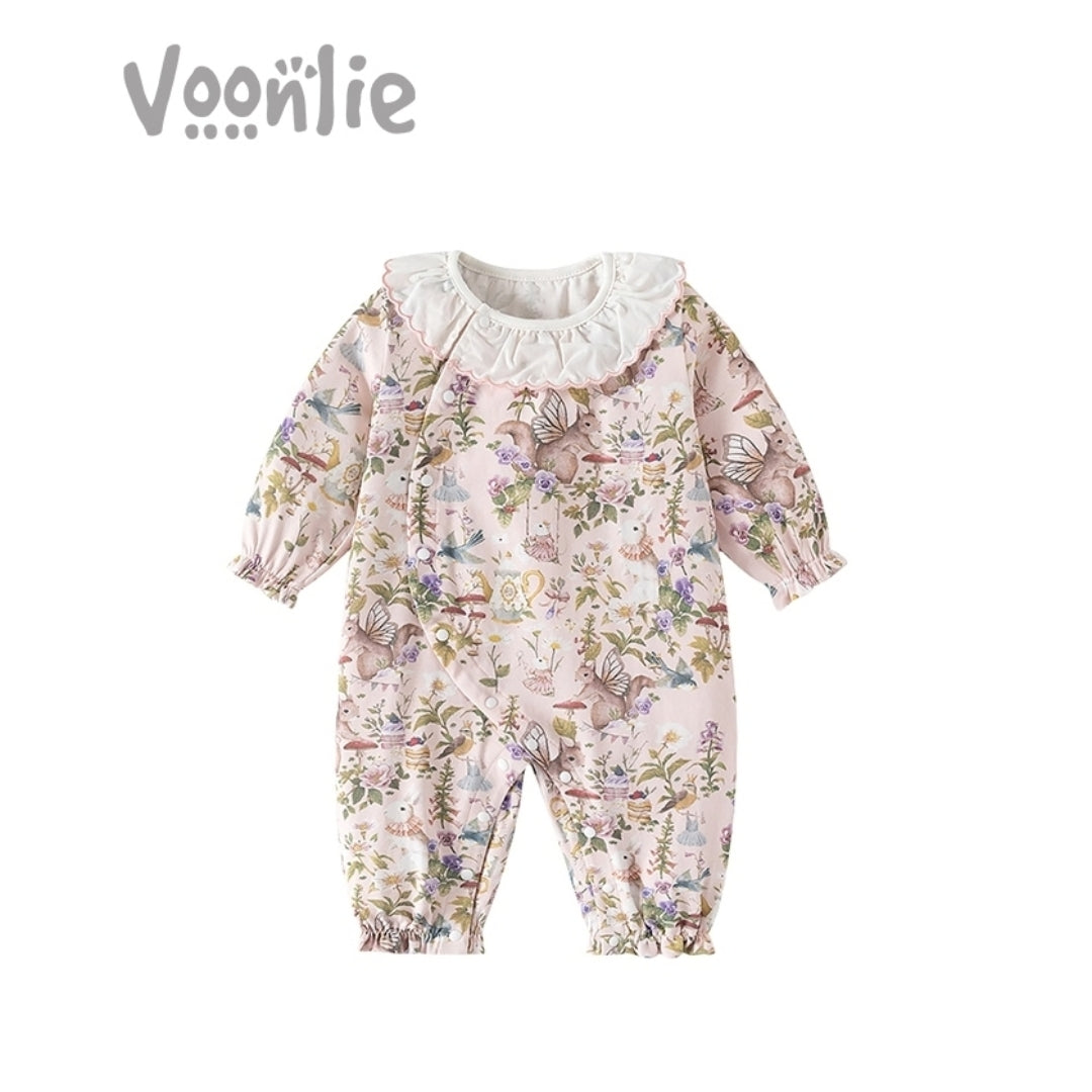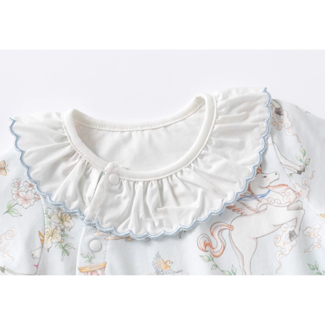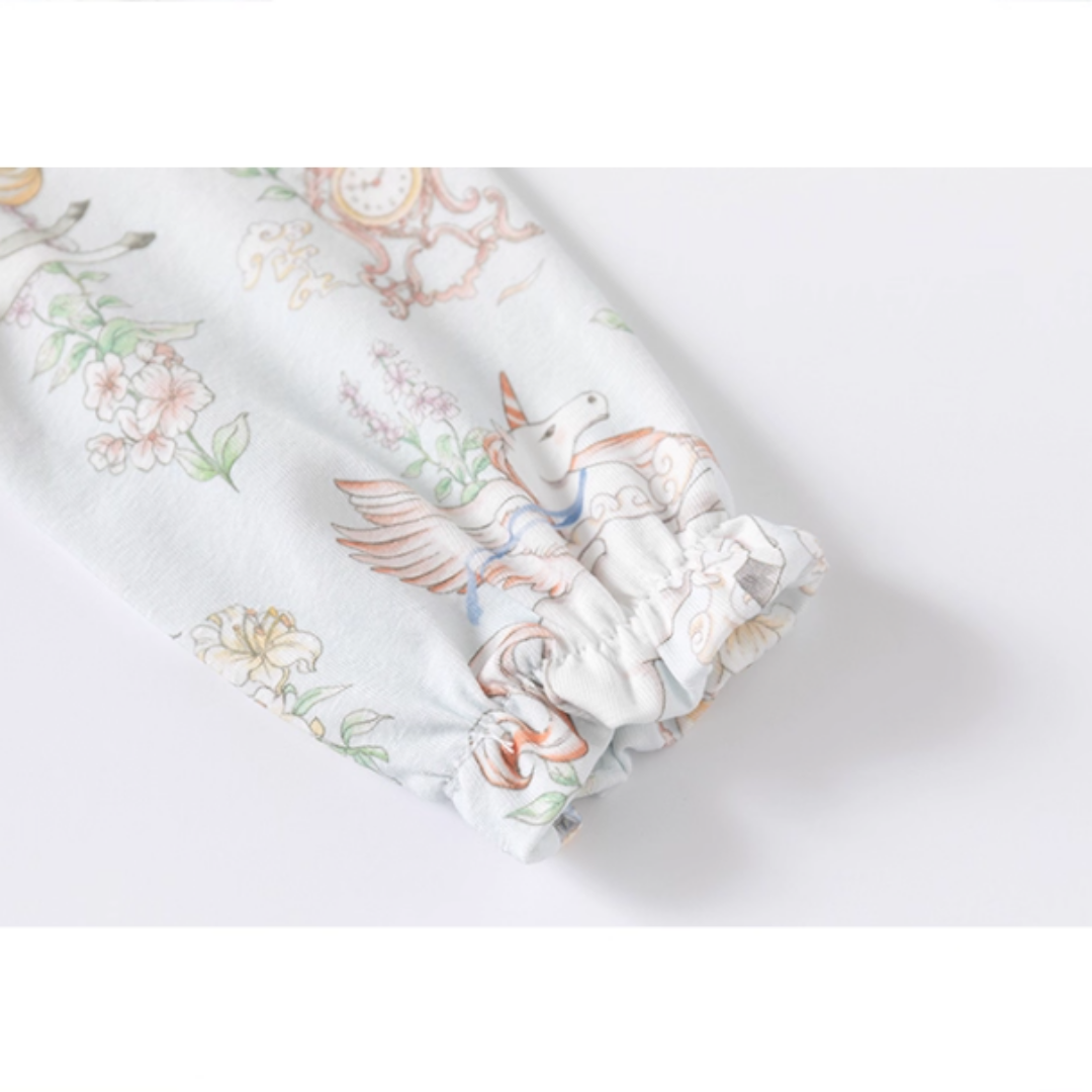くしゅっとした袖と襟が特徴的な特別なデザインのロンパース。