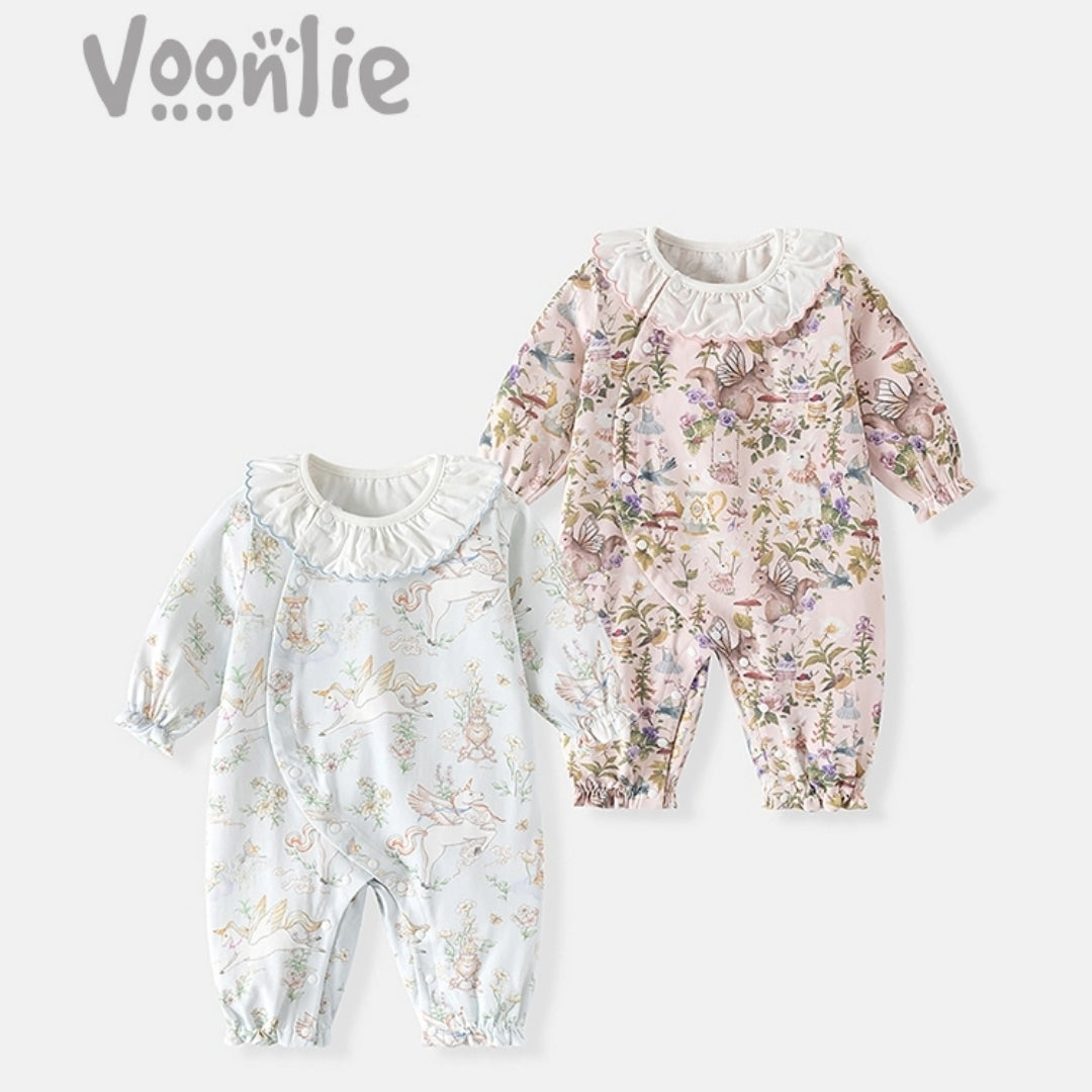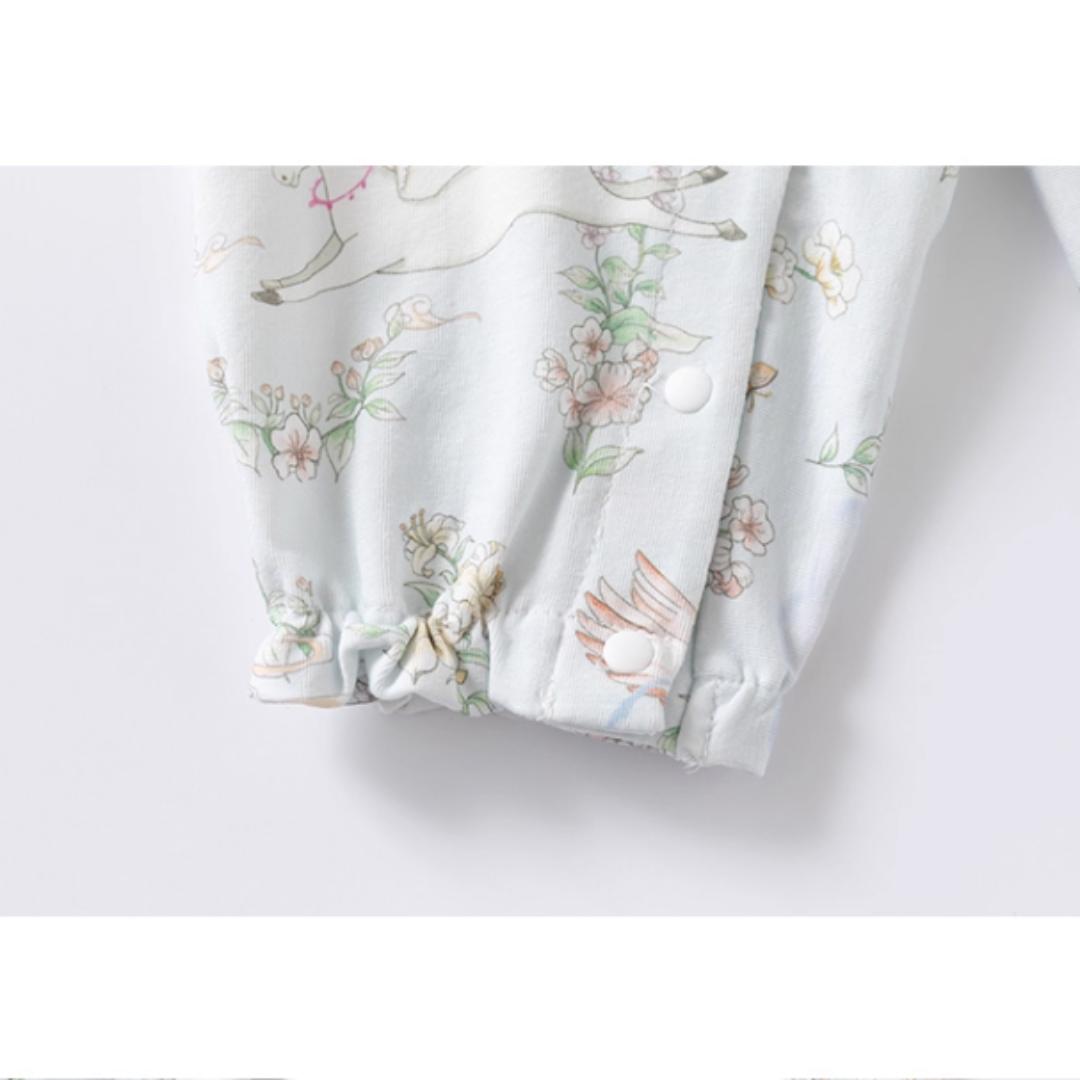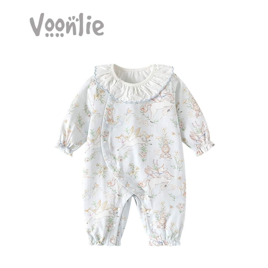 やわらかなコットン素材で赤ちゃんの肌にやさしく、前開き仕様なのでお着替えやおむつ替えもスムーズです◎