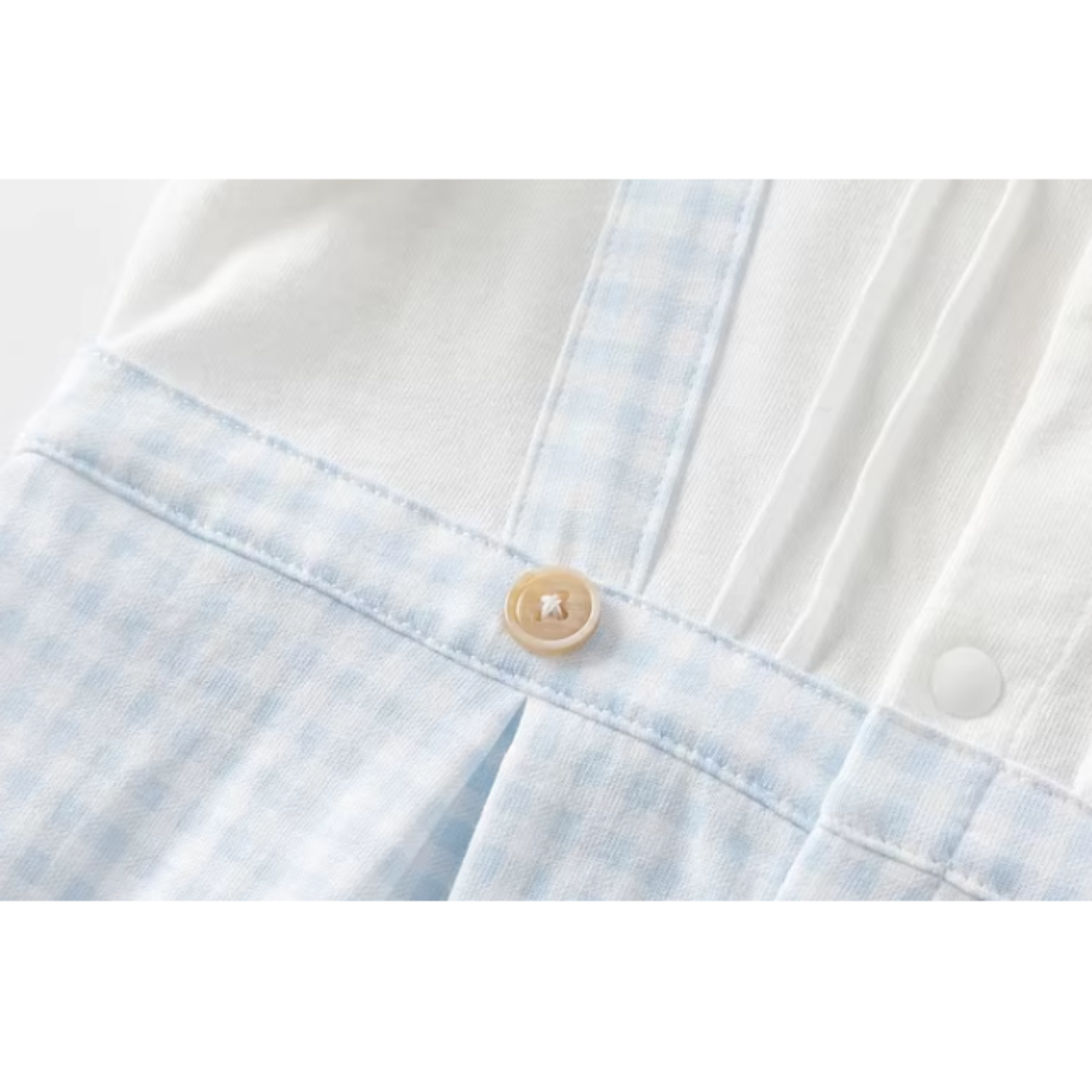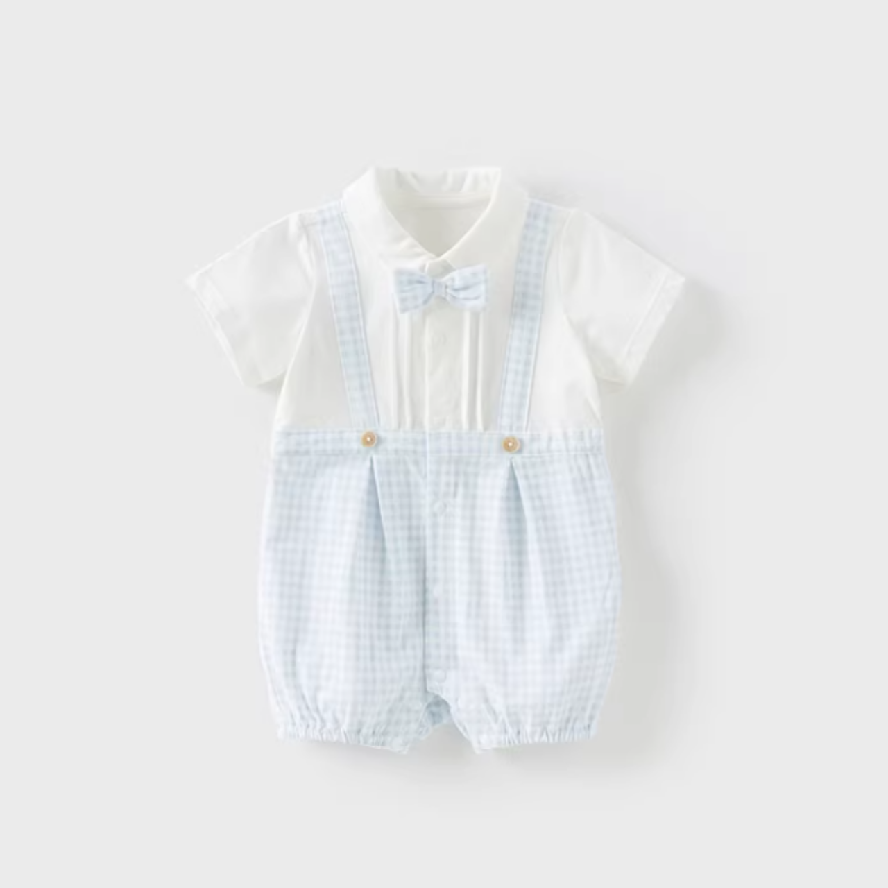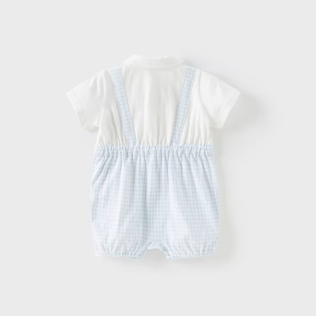 やさしいライトブルーのギンガムチェックが爽やかな印象のロンパース♪