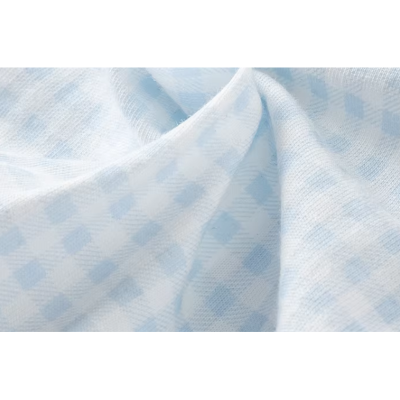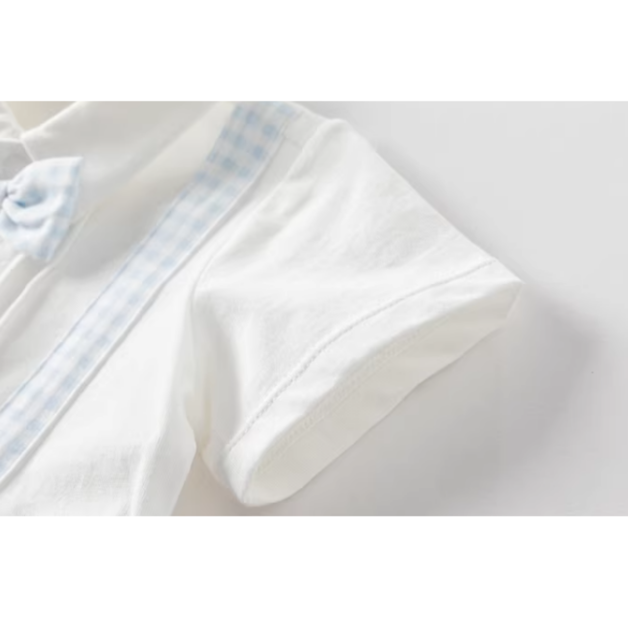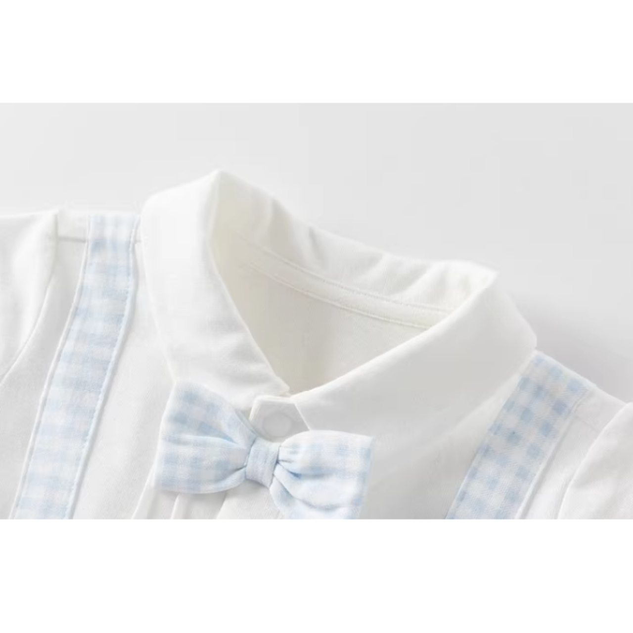 やさしいライトブルーのギンガムチェックが爽やかな印象のロンパース♪