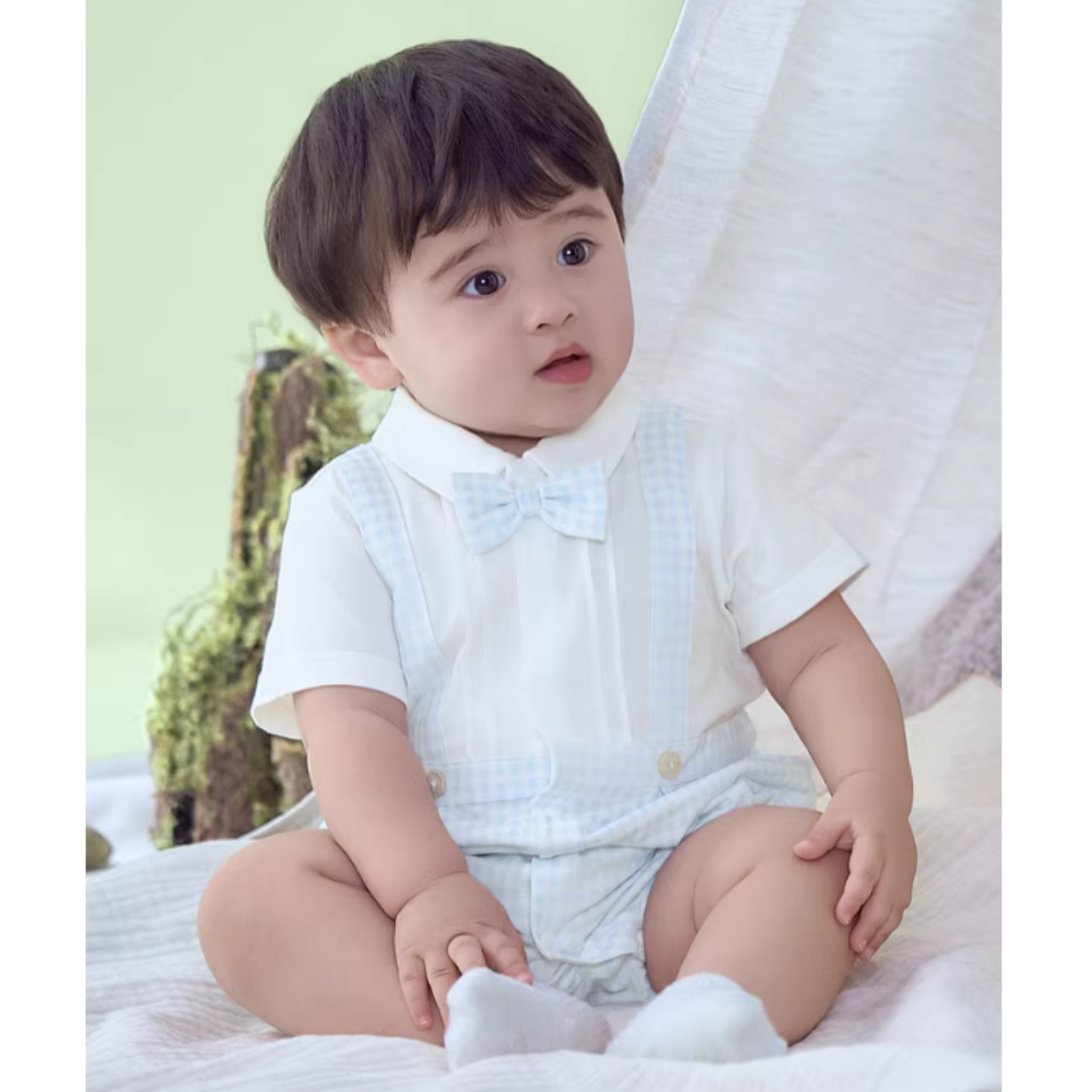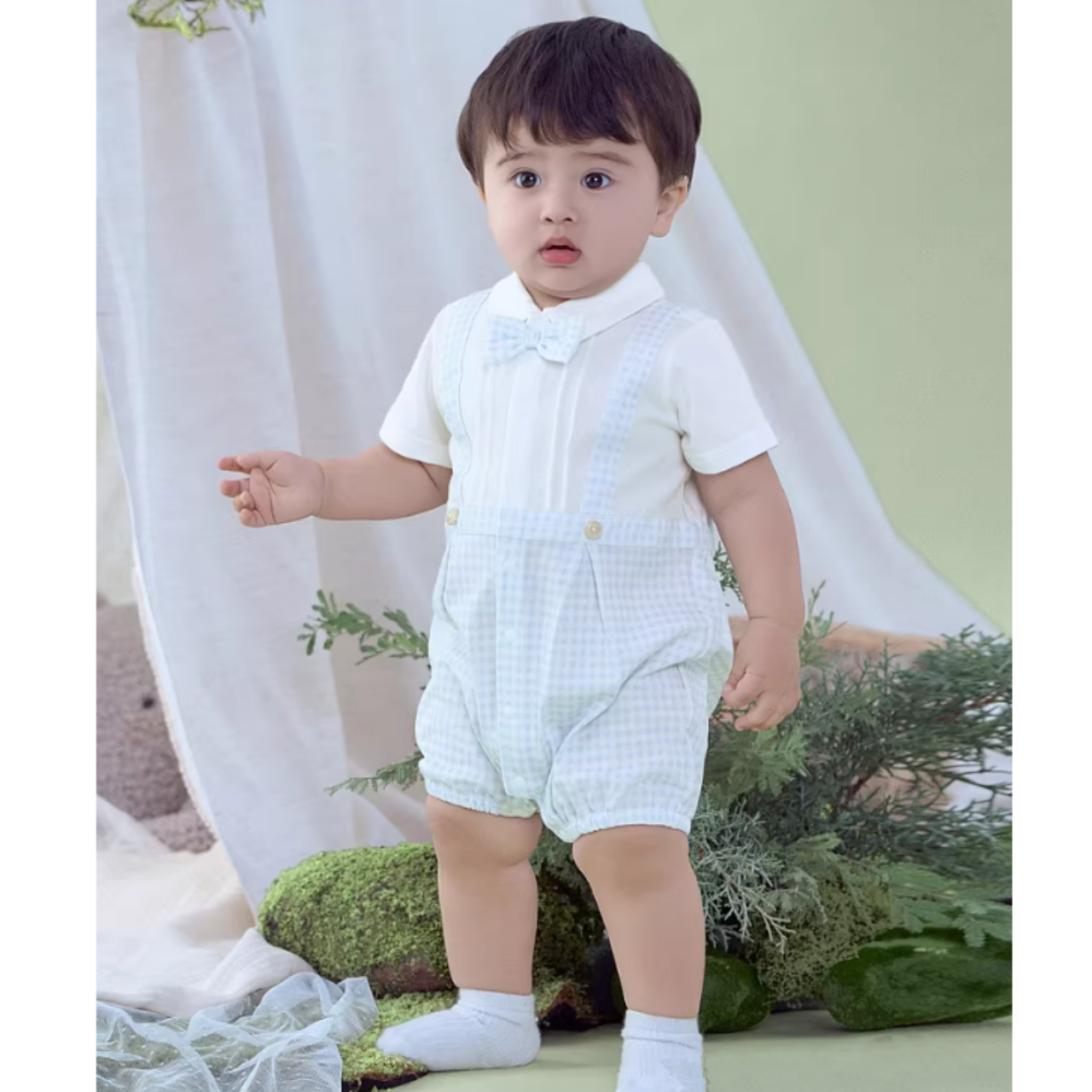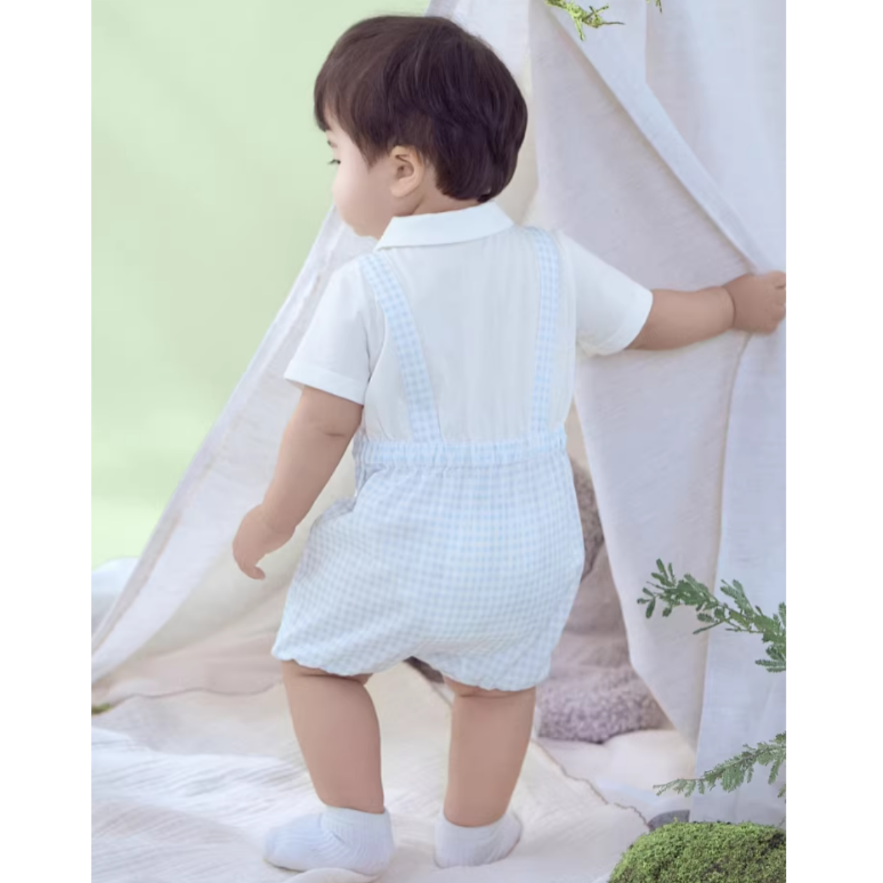 半袖シャツとサスペンダー付きハーフパンツのレイヤード風デザインで、上品に着こなせます◎