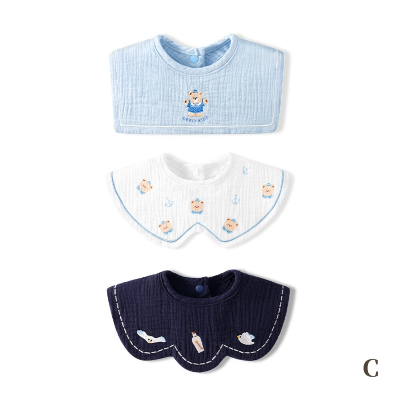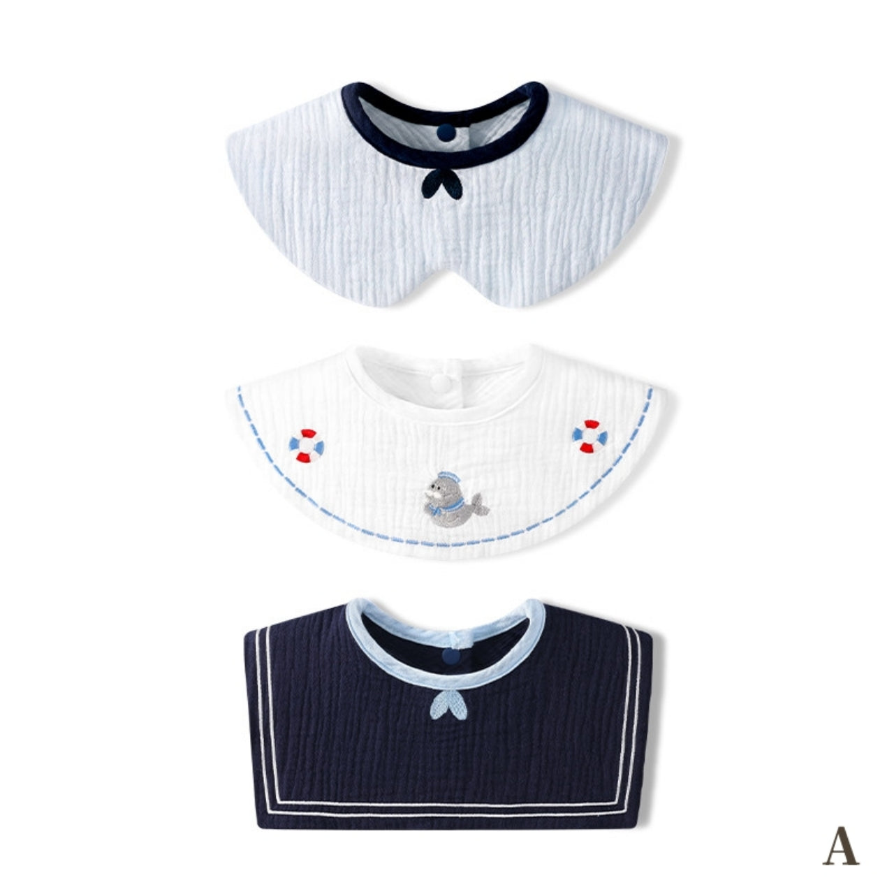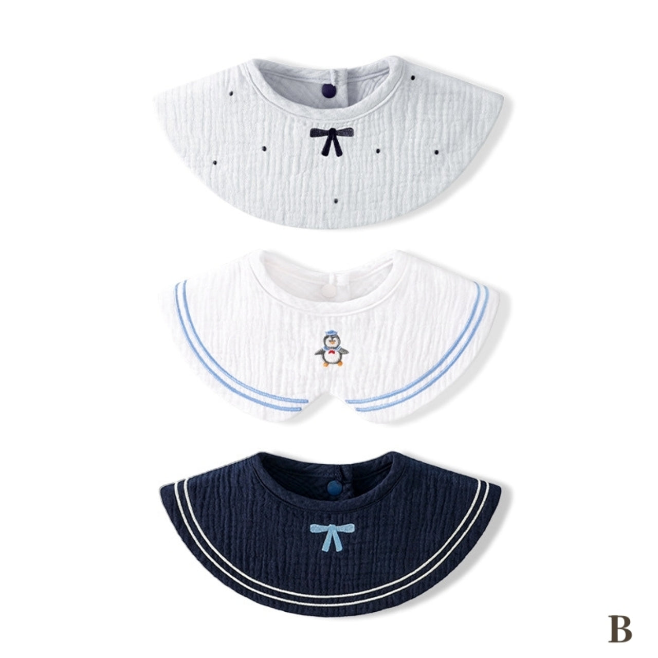 デザイン違いが楽しめる、便利な3枚セットのスタイ。