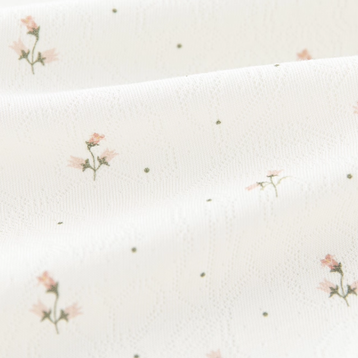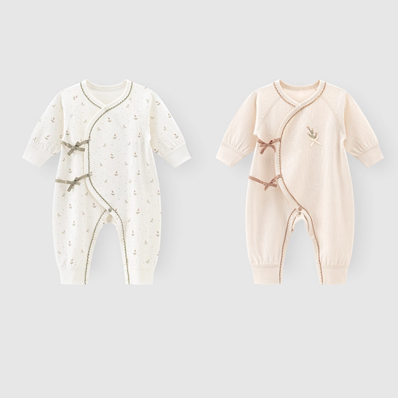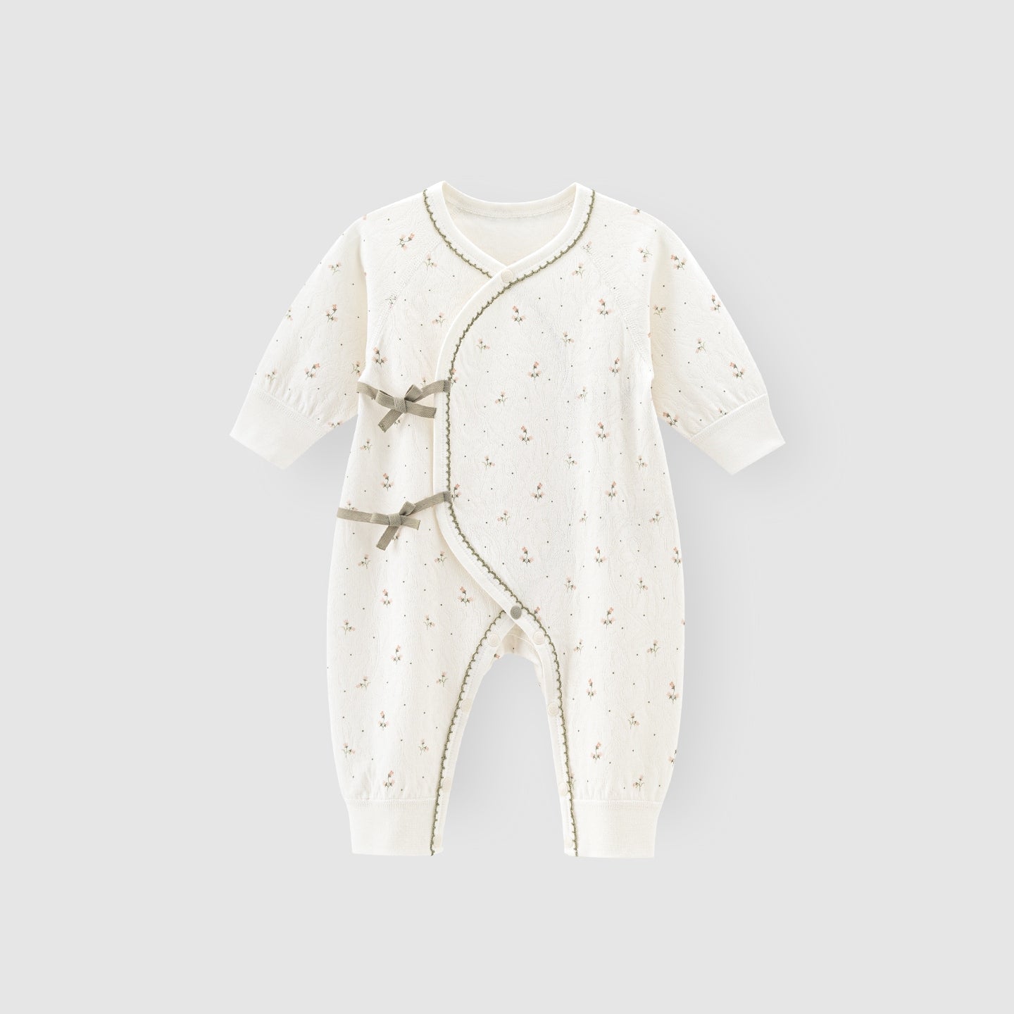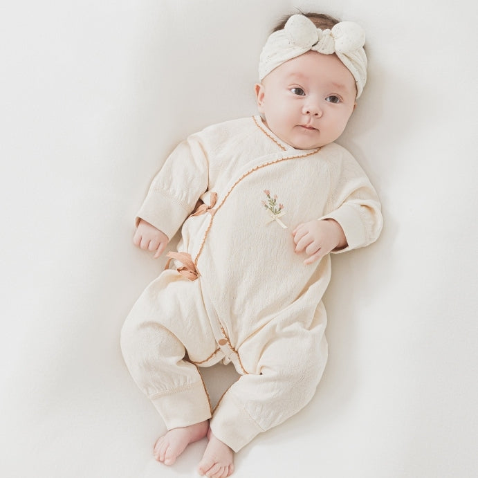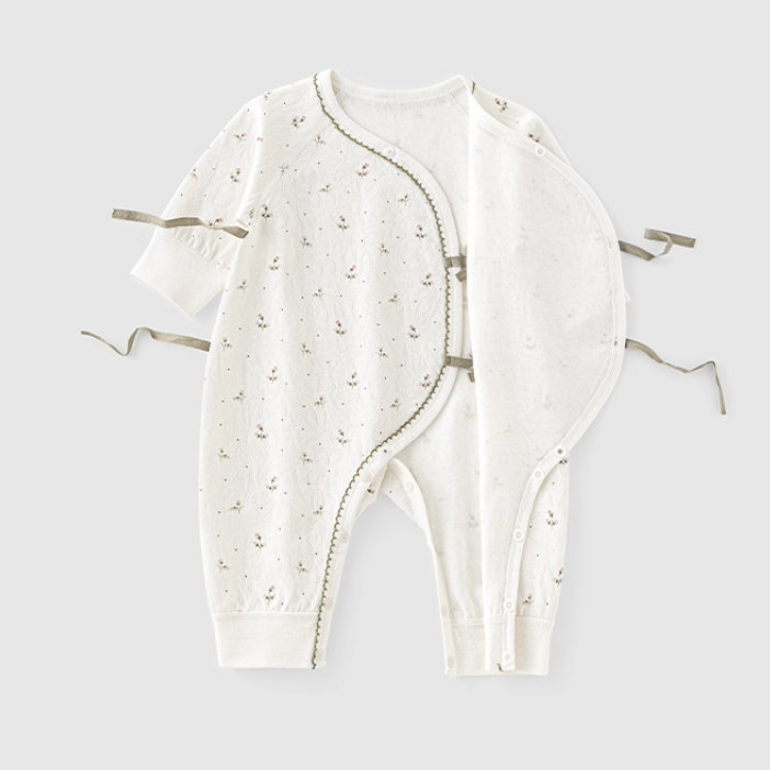 上品な花柄モチーフがやさしい雰囲気のニューボーンロンパースです。