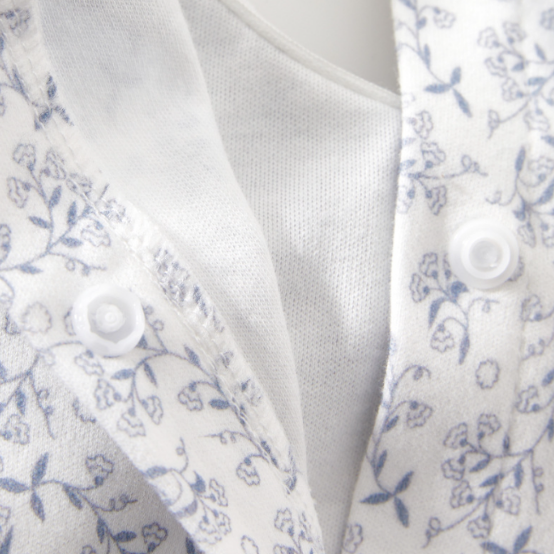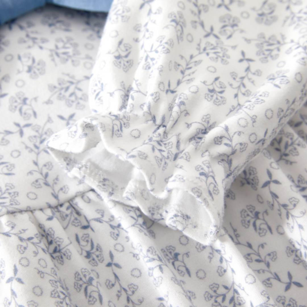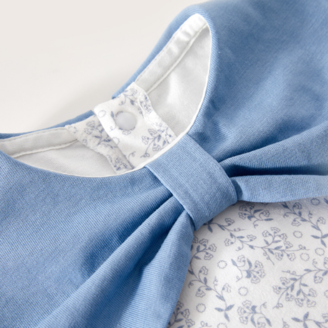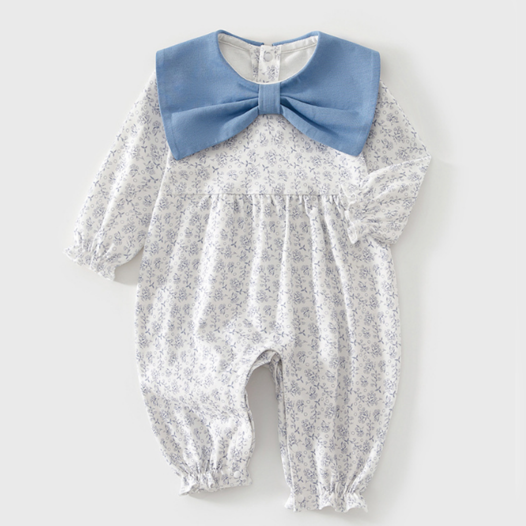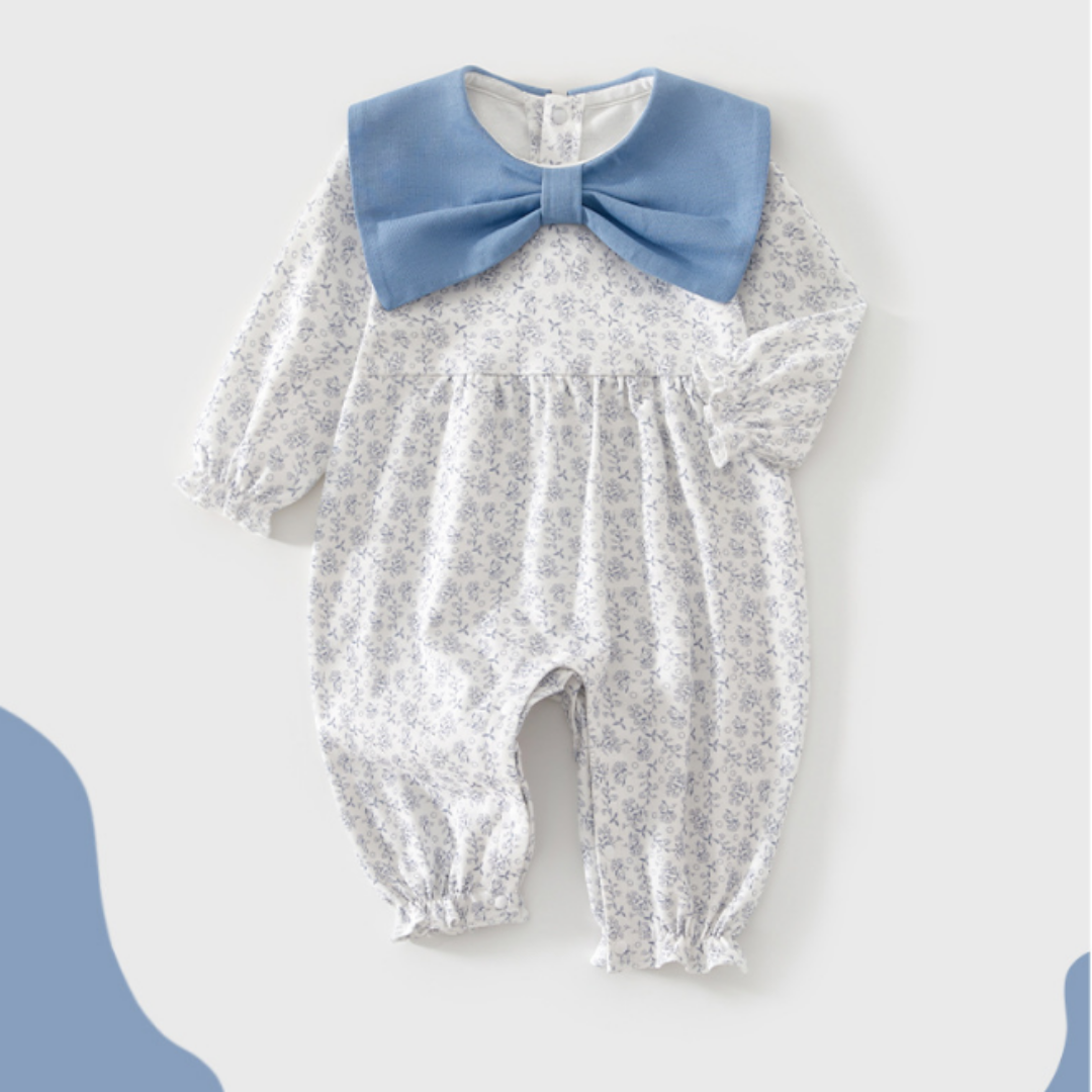 大きなリボンデザインの襟が目を引く、華やかで可愛らしいロンパース。