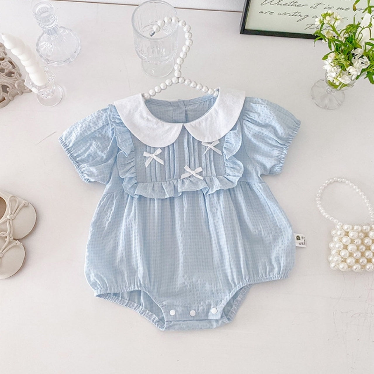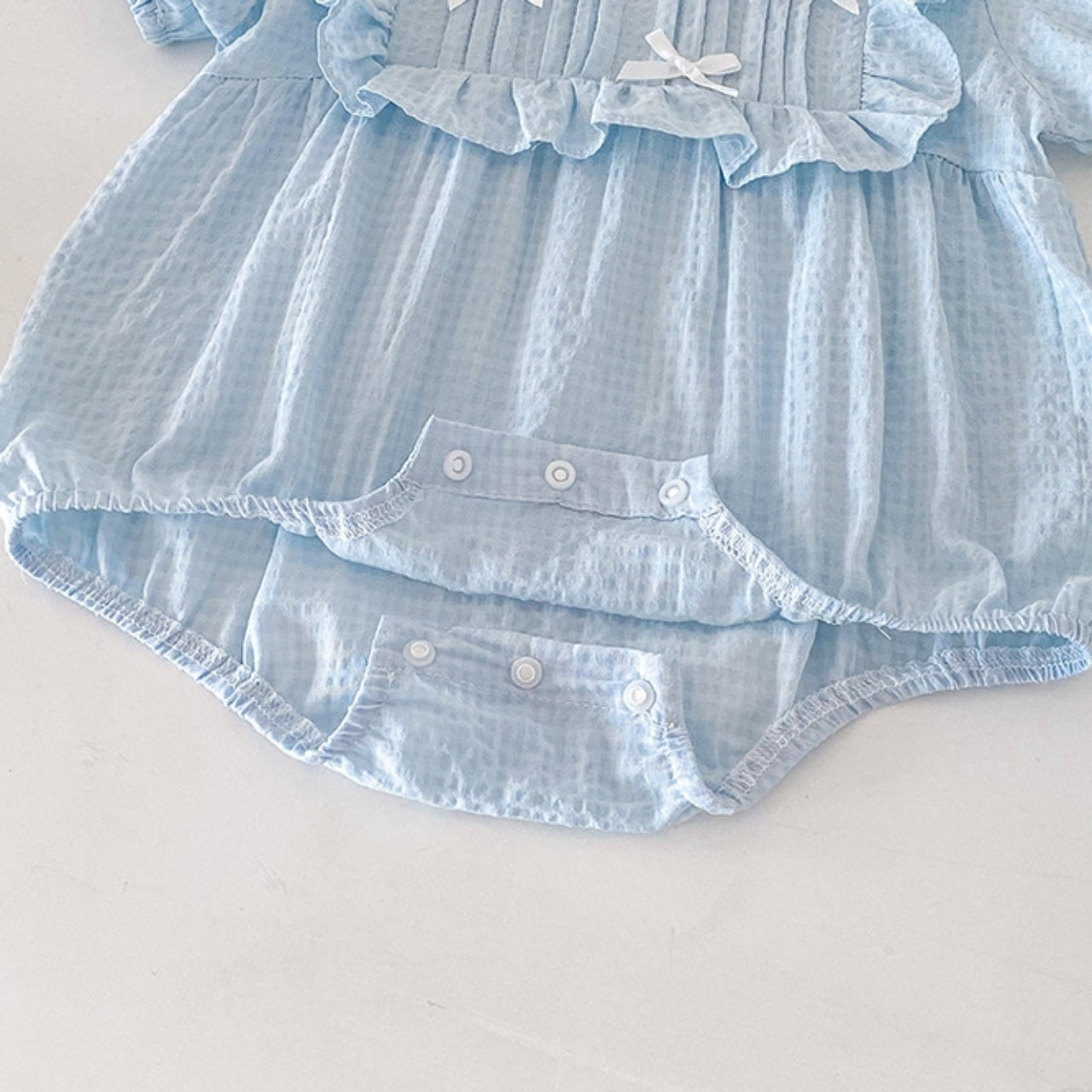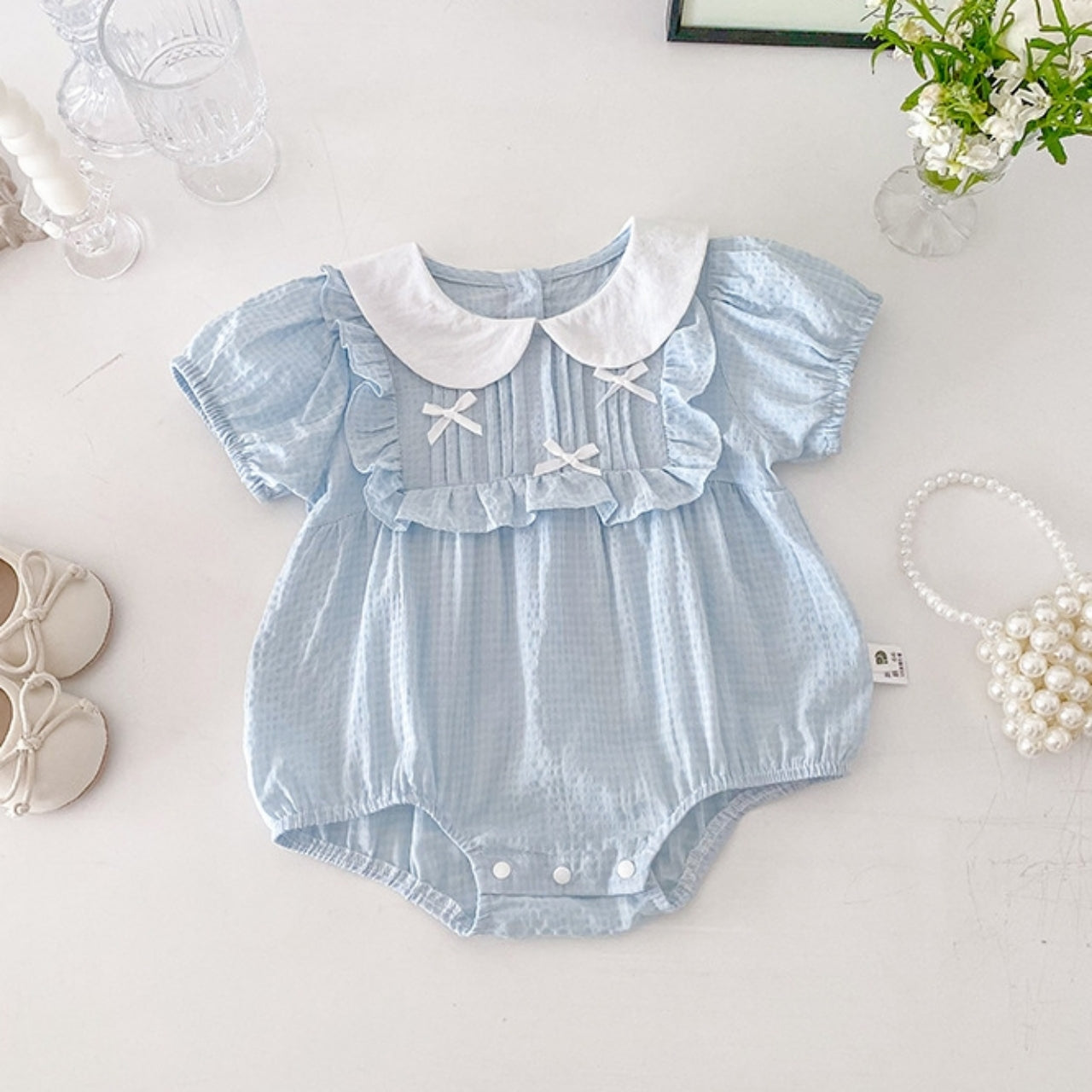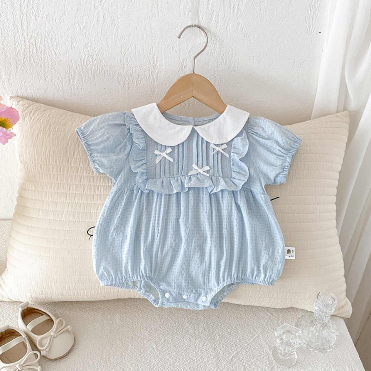涼しげな淡いブルーカラーがやさしいリボンロンパース♪