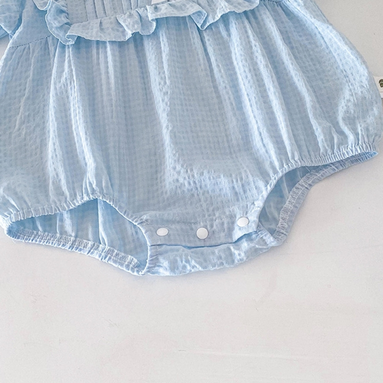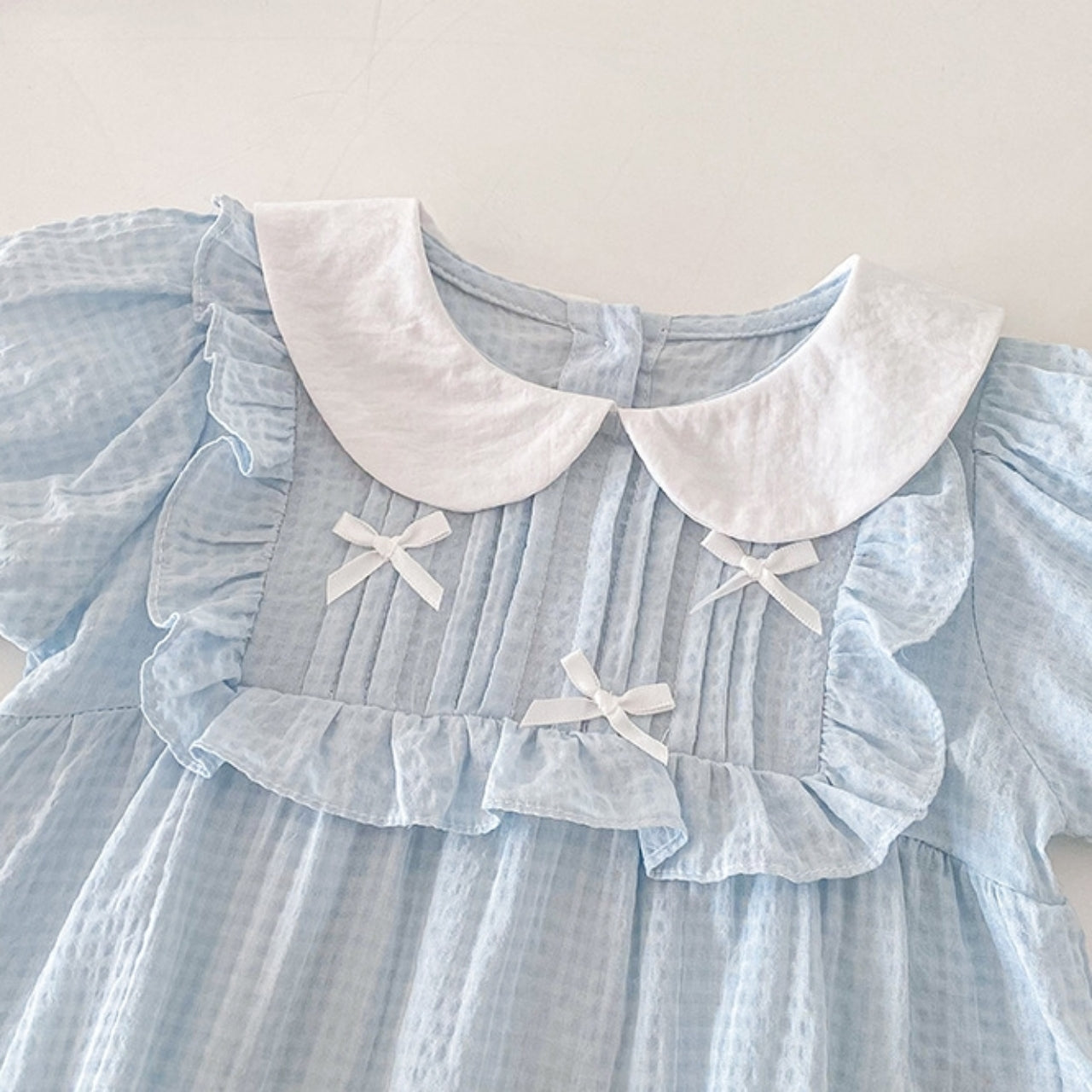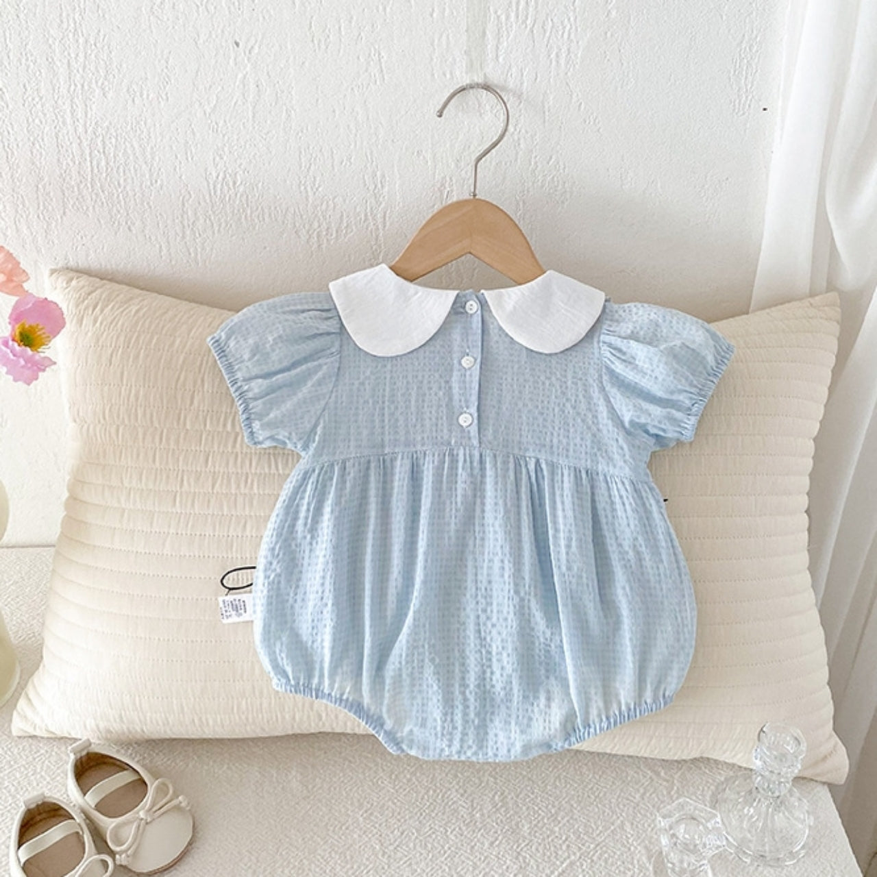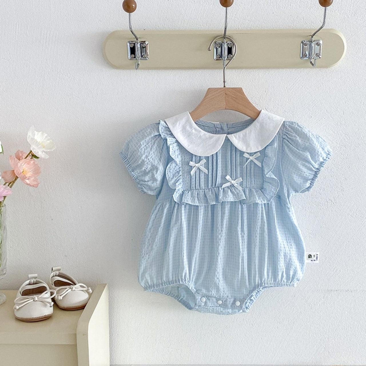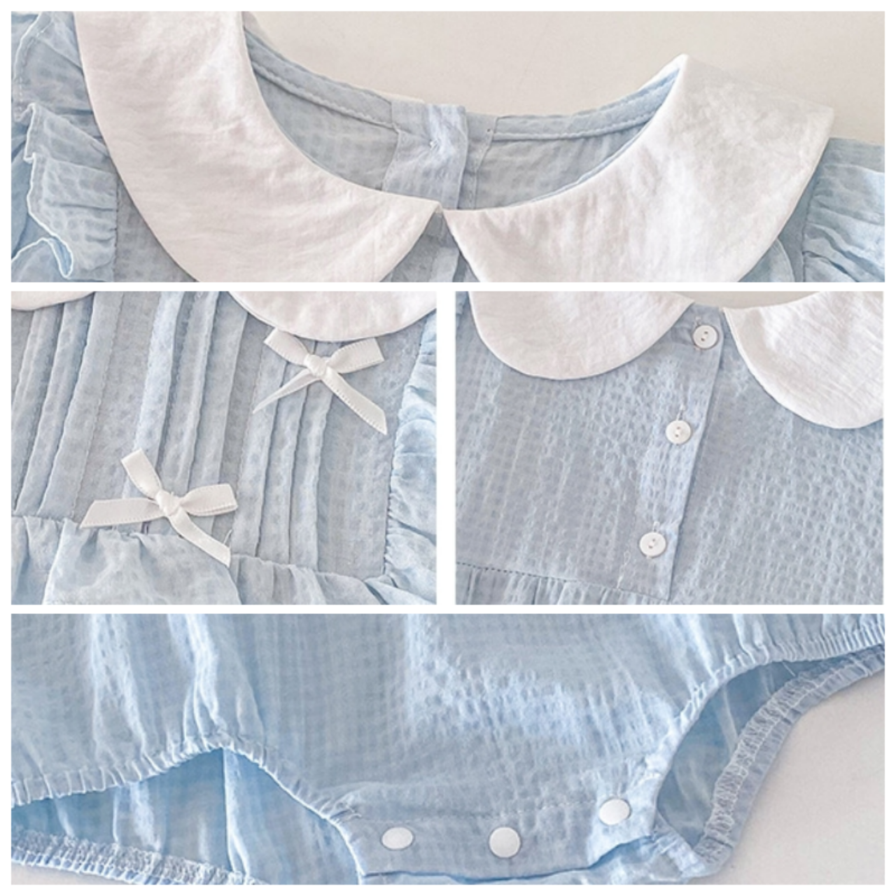 涼しげな淡いブルーカラーがやさしいリボンロンパース♪