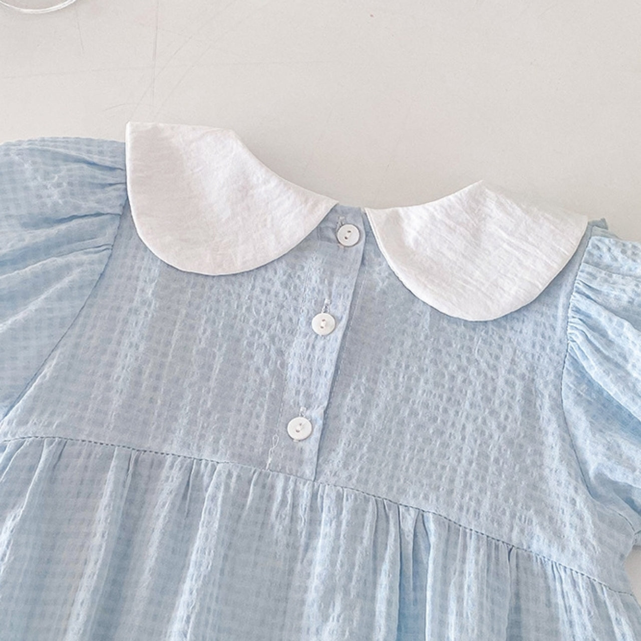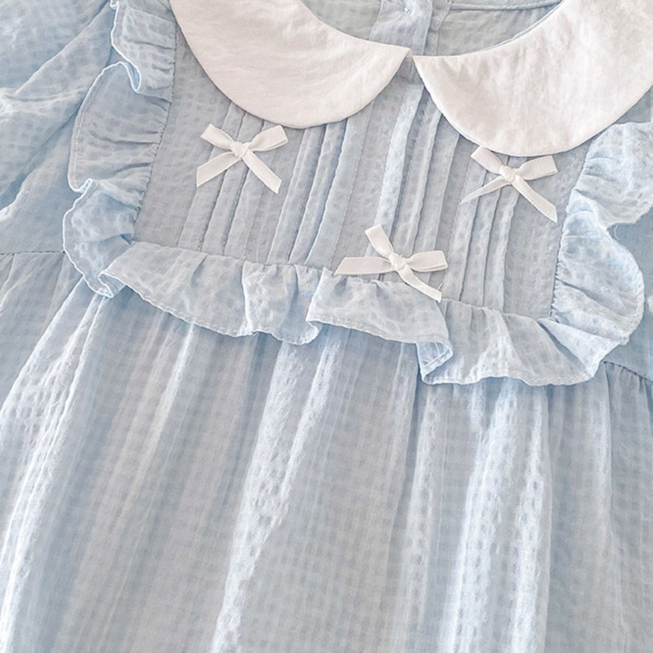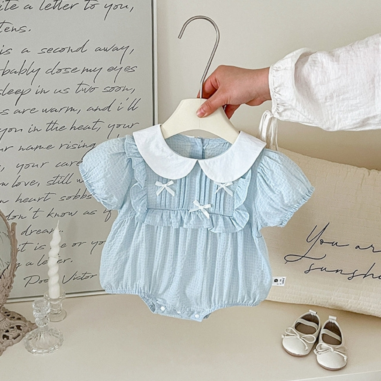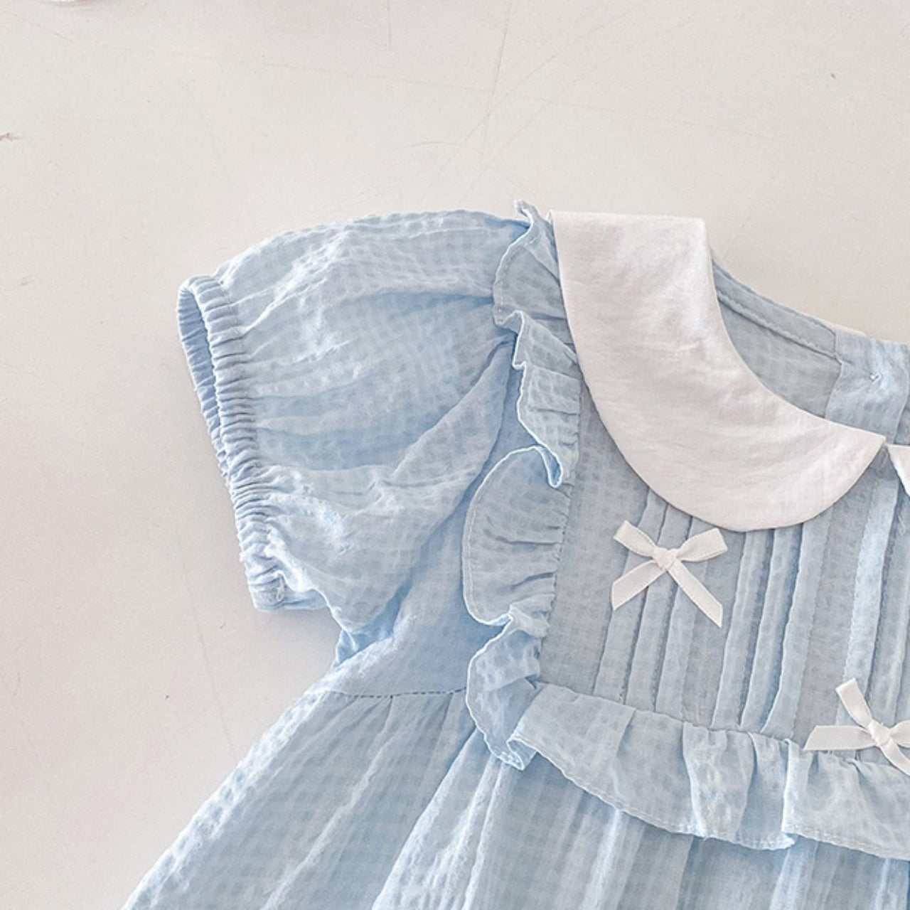 涼しげな淡いブルーカラーがやさしいリボンロンパース♪