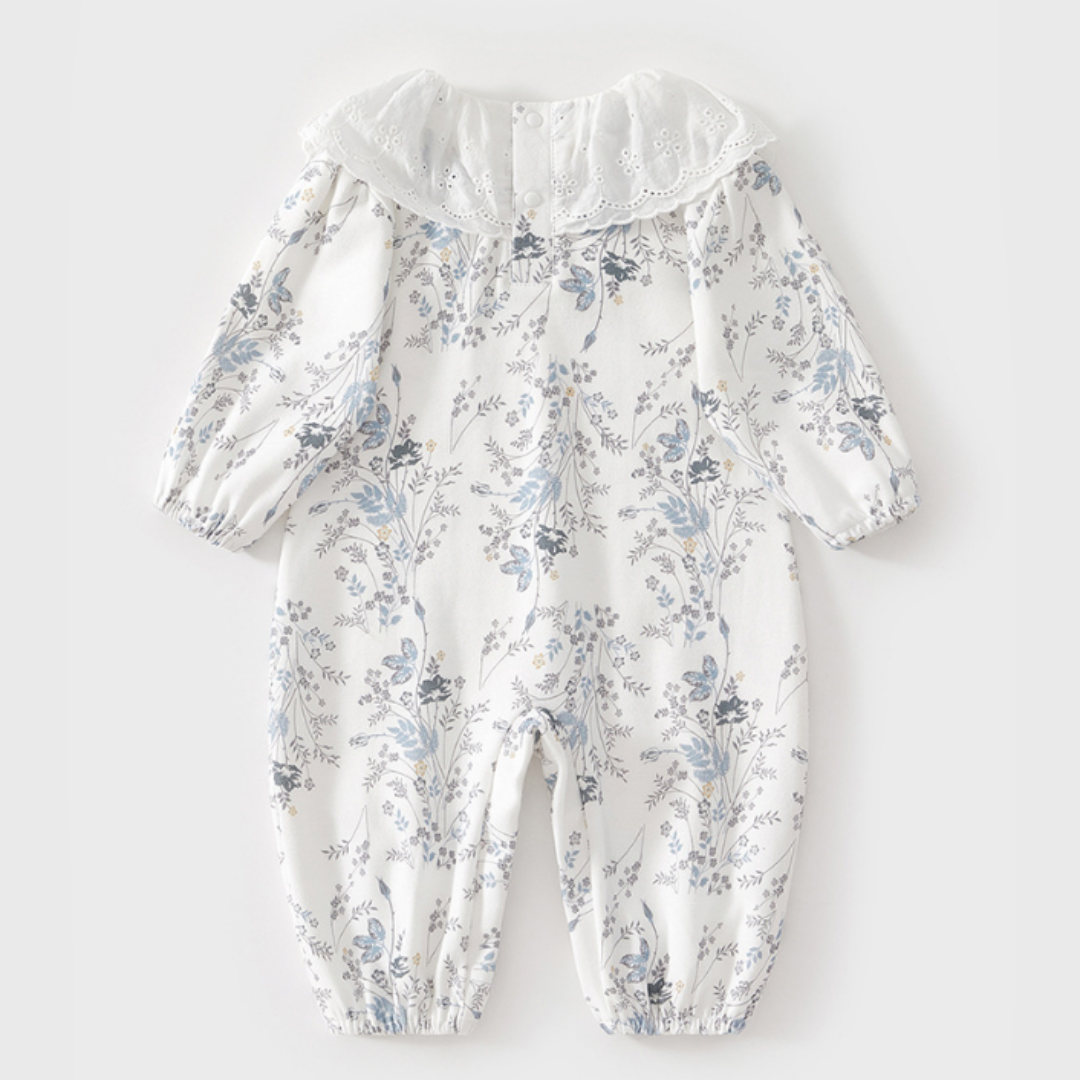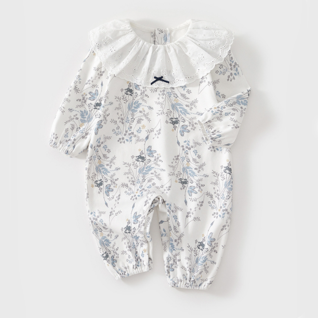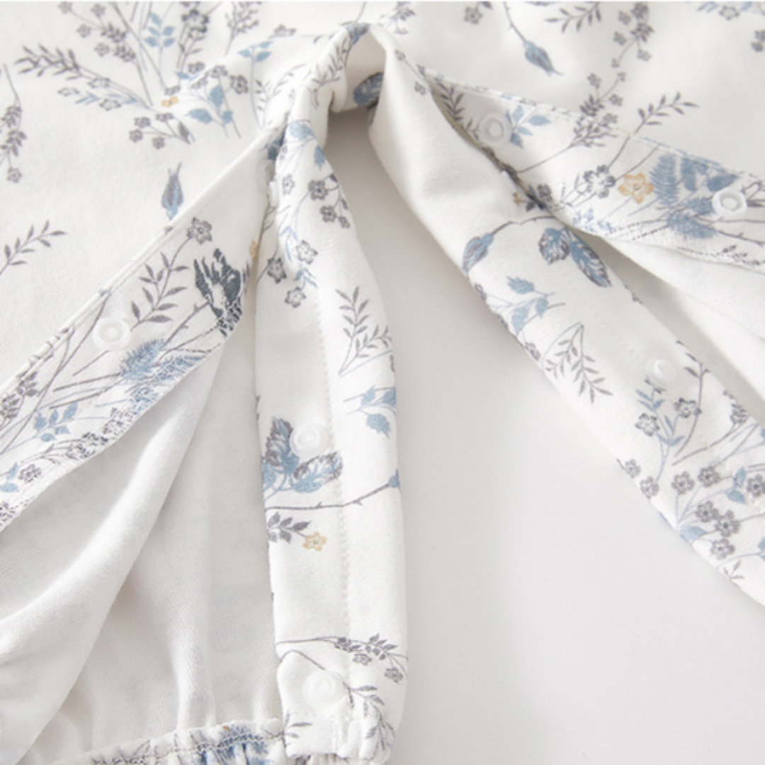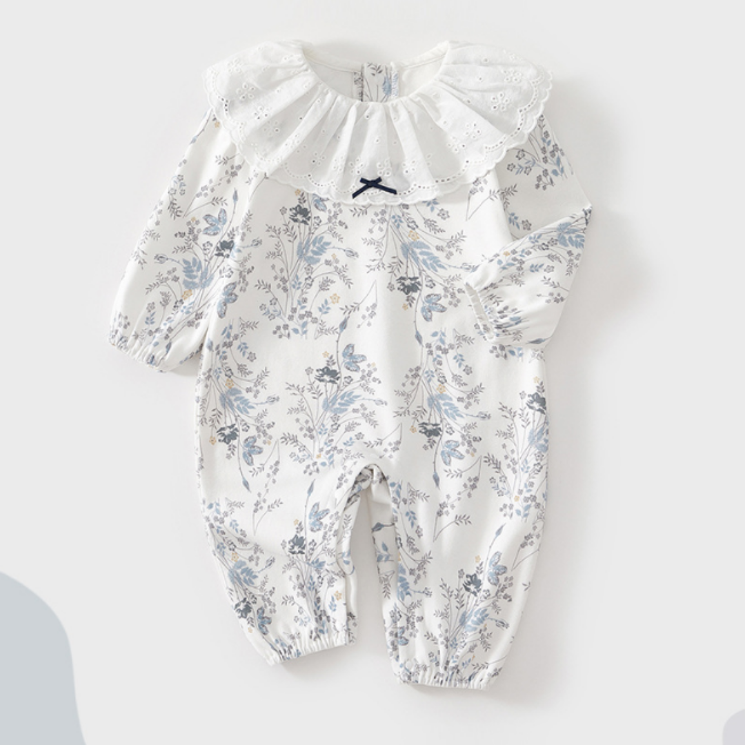 ホワイトを基調にした上品な花柄が魅力のロンパース。