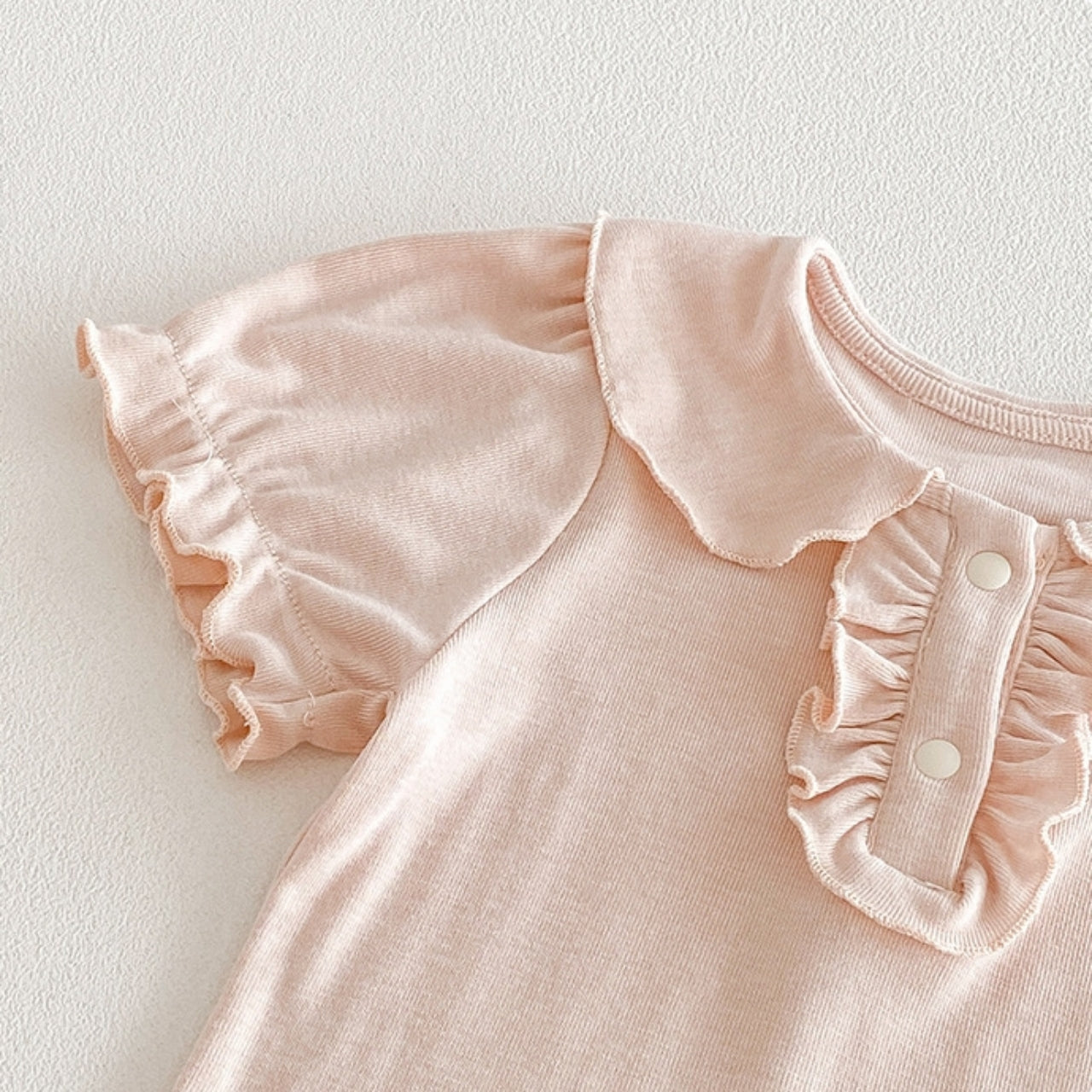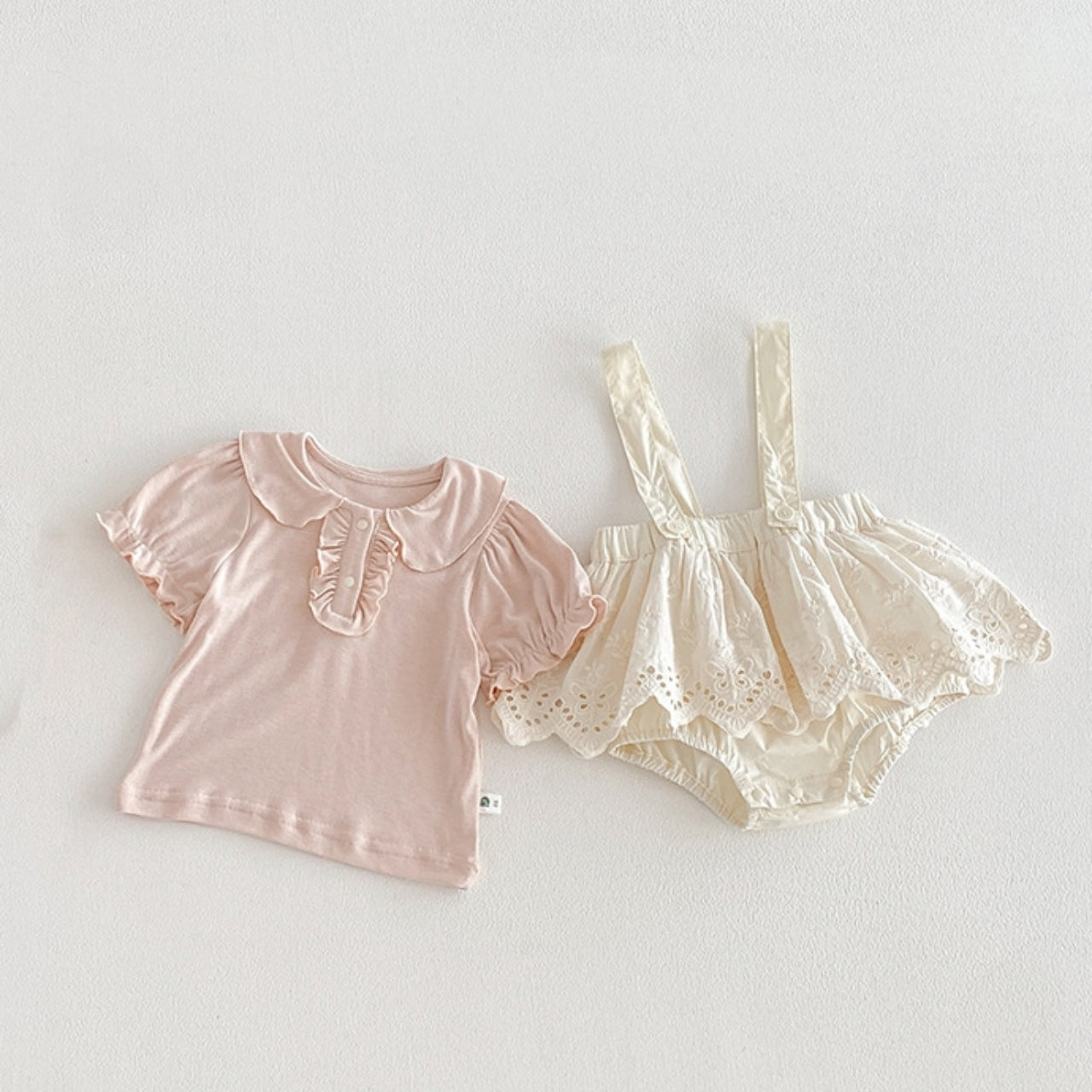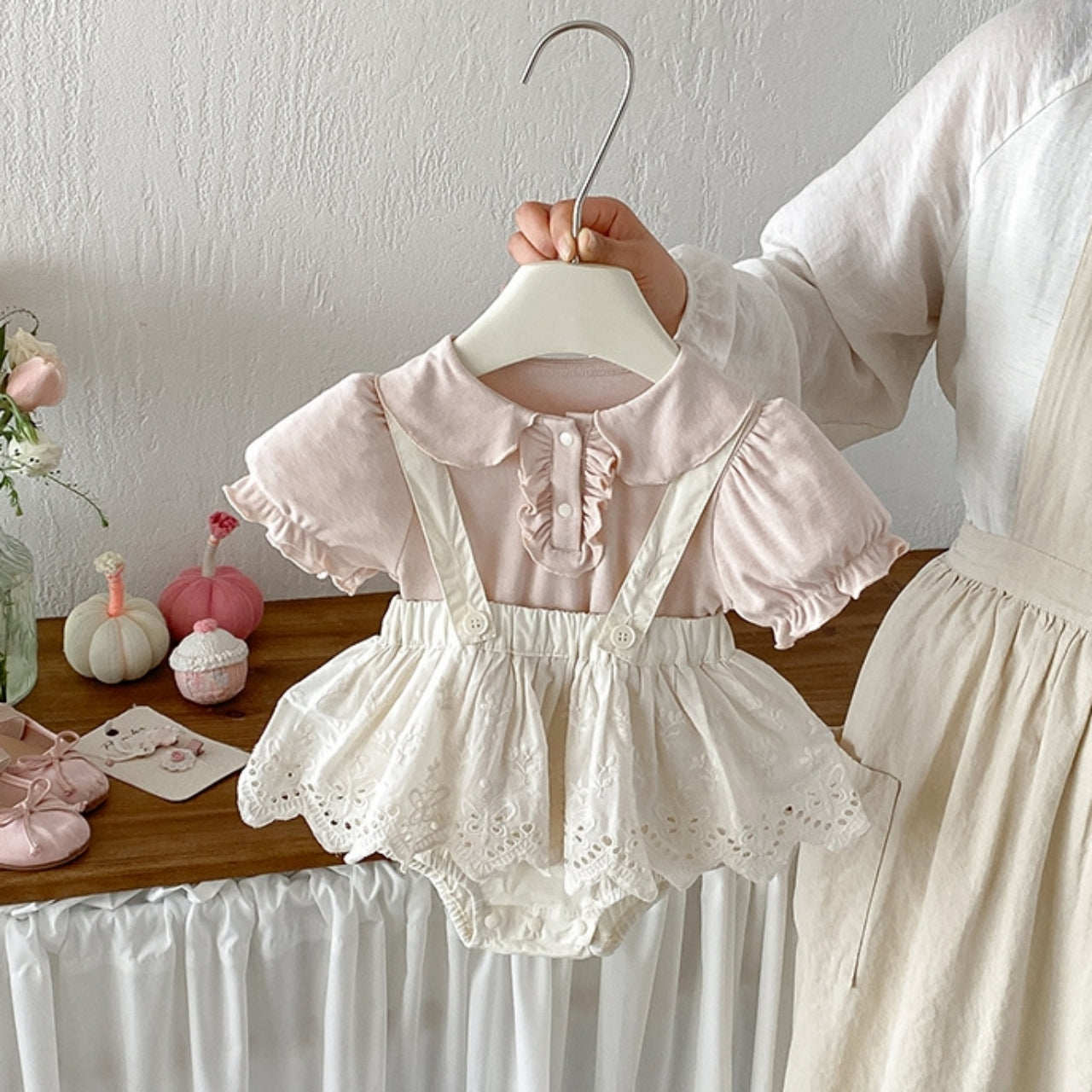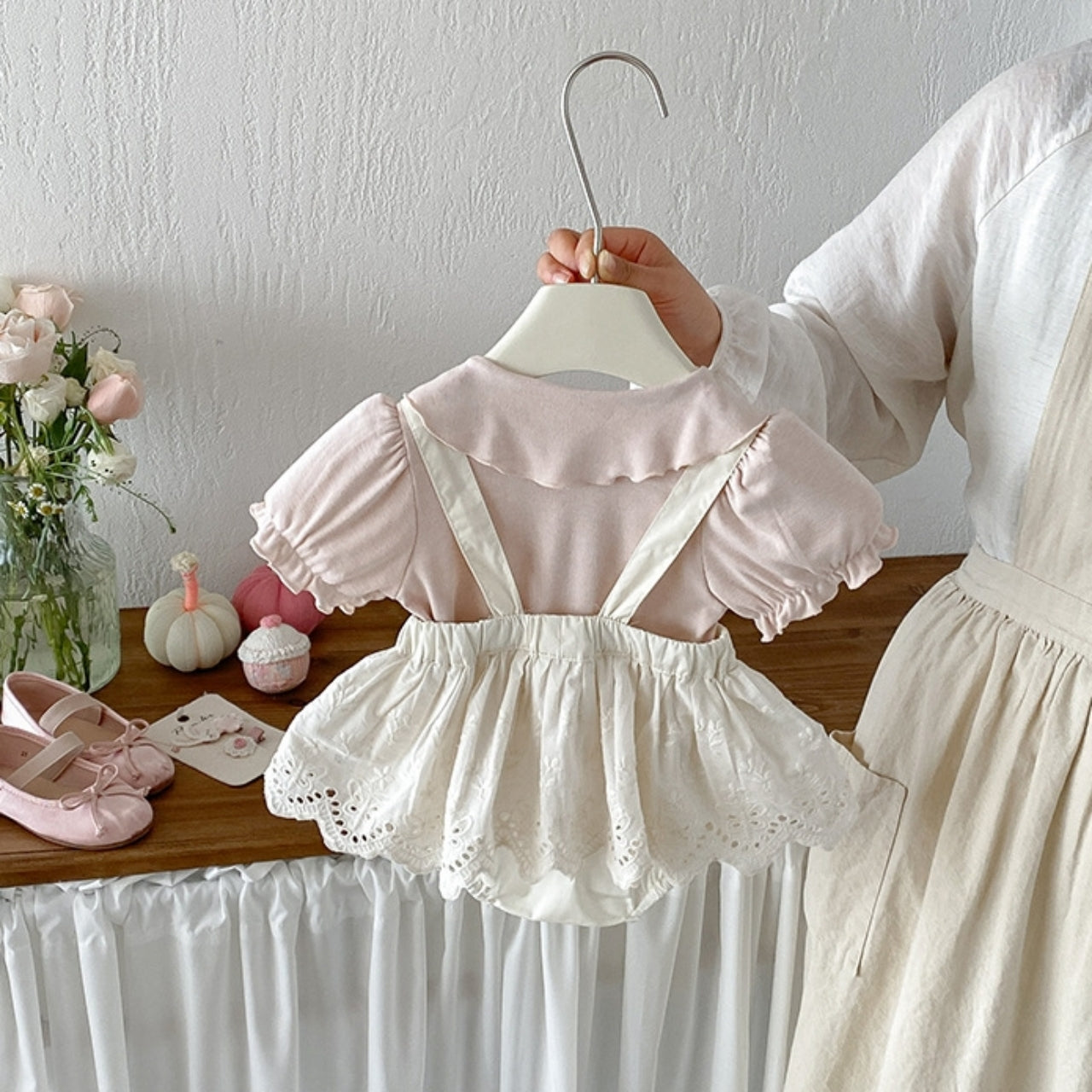 ピンクの半袖トップスと、カットワークレースロンパースの上品なセットアップ♪