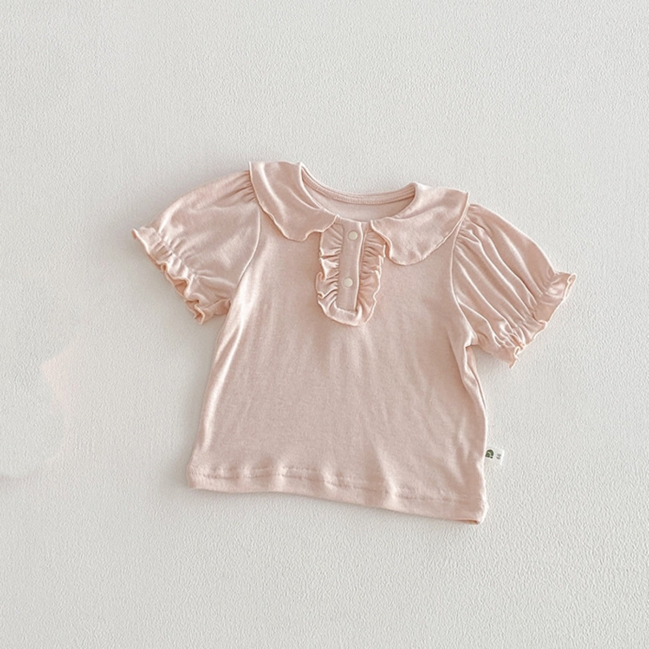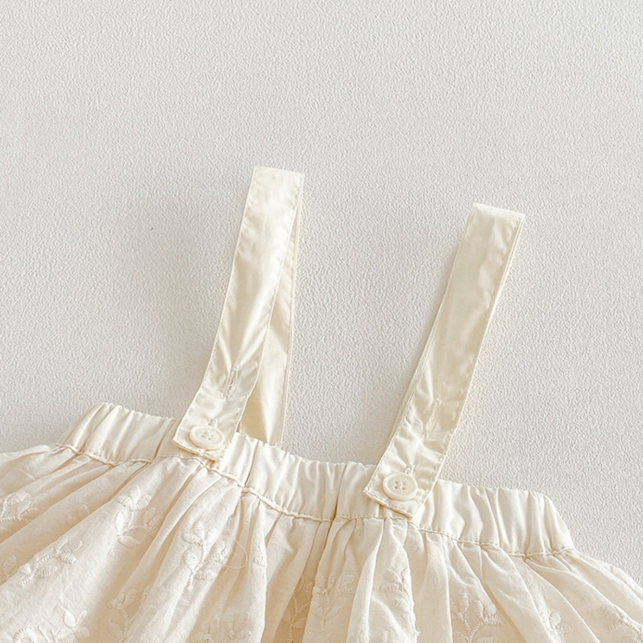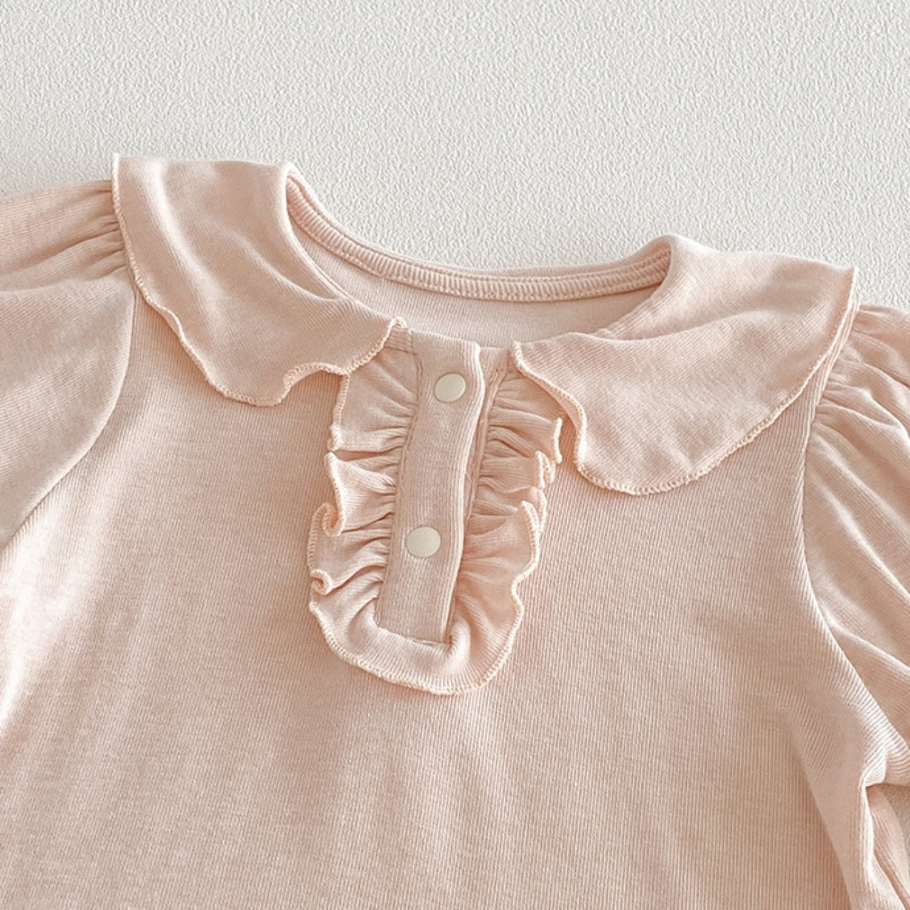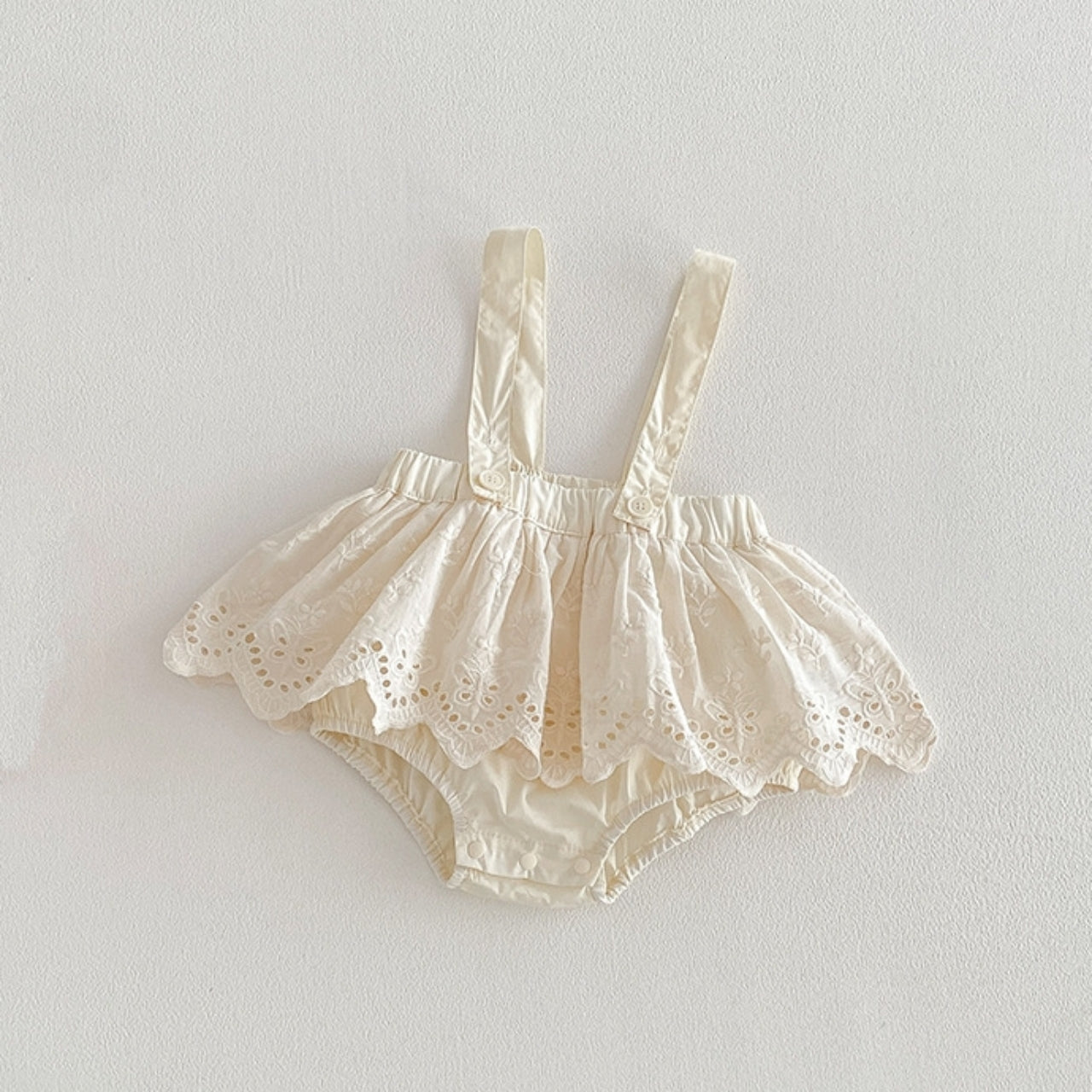 ピンクの半袖トップスと、カットワークレースロンパースの上品なセットアップ♪