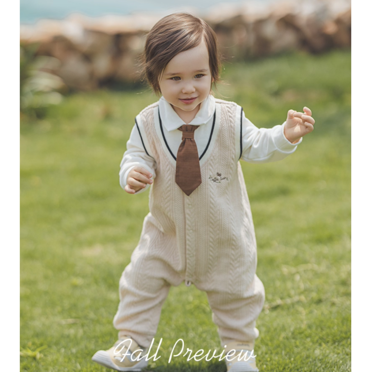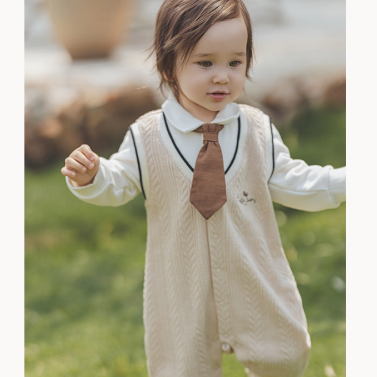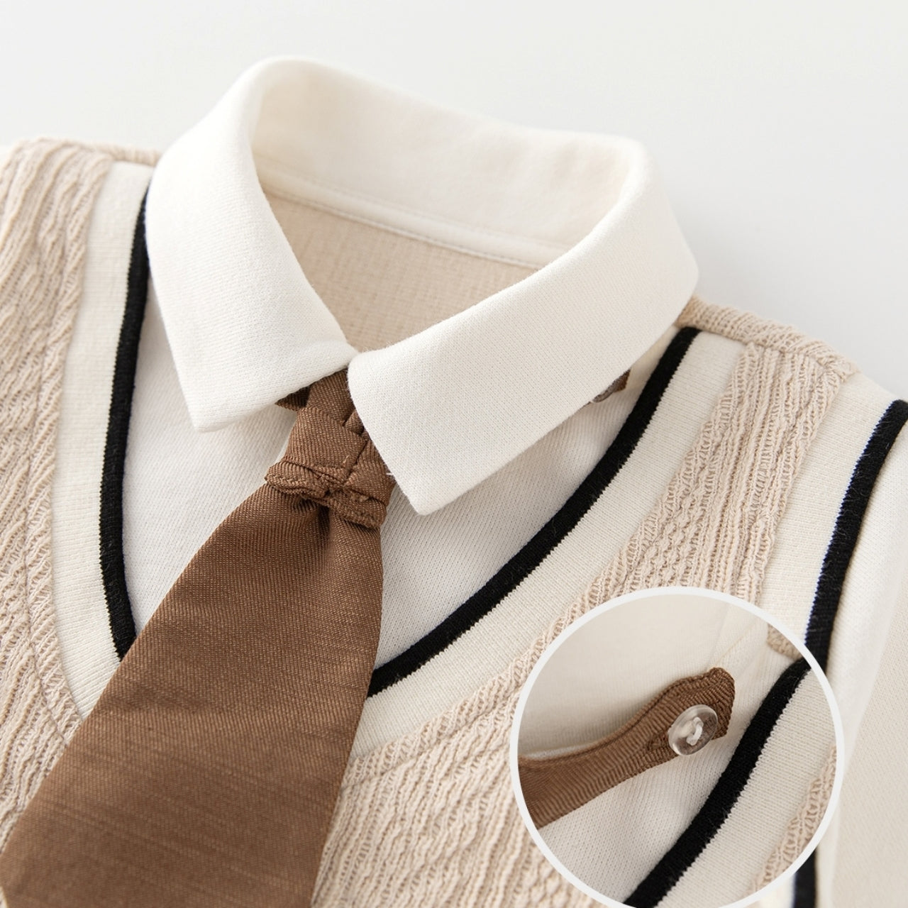 ネクタイ付きシャツとニットロンパースを重ね着したようなレイヤード風デザインです。