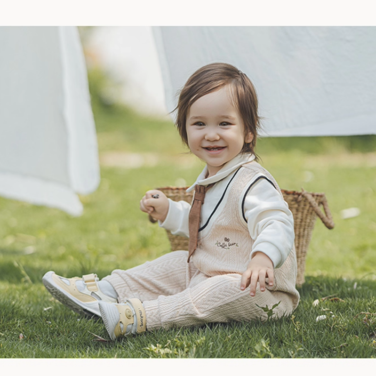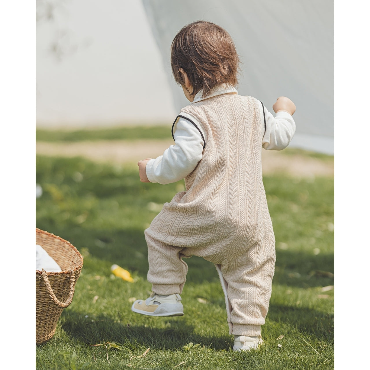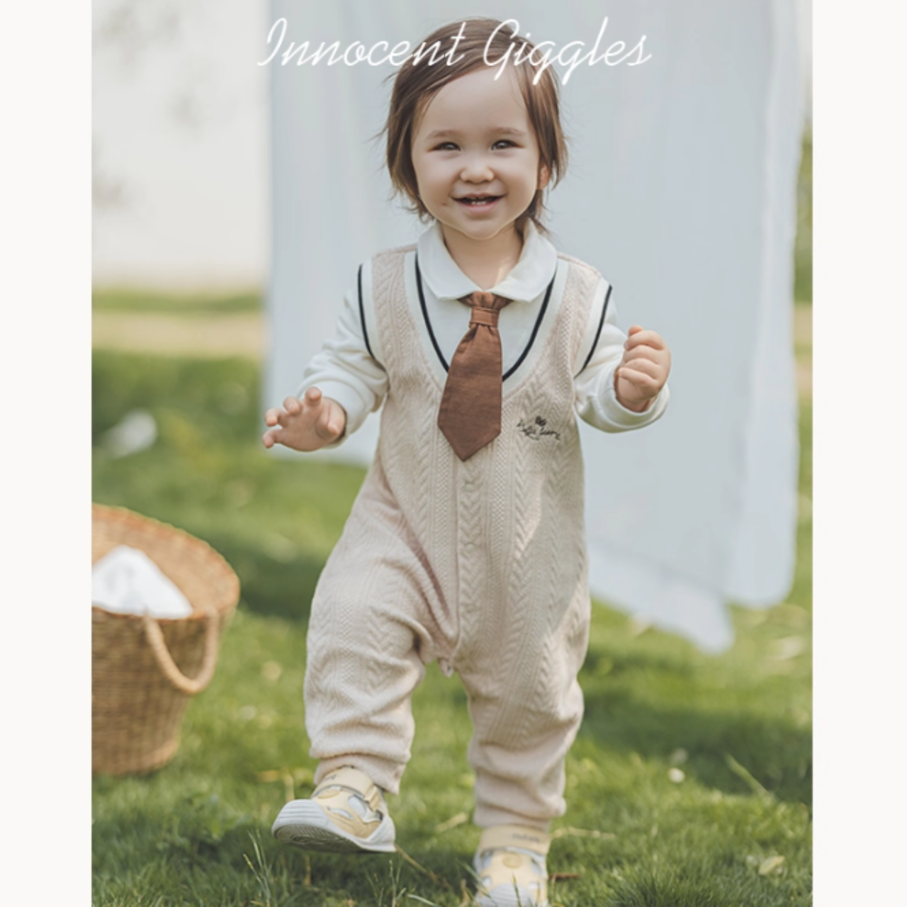 ネクタイ付きシャツとニットロンパースを重ね着したようなレイヤード風デザインです。