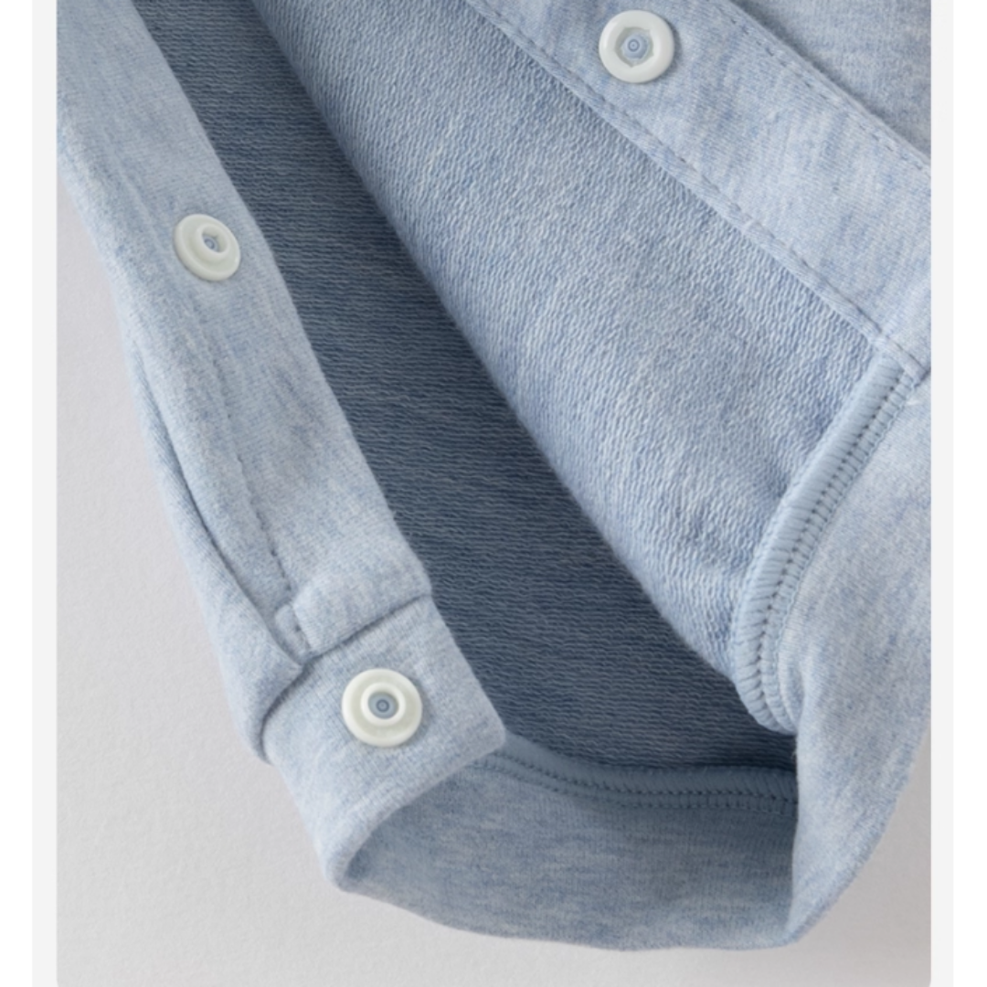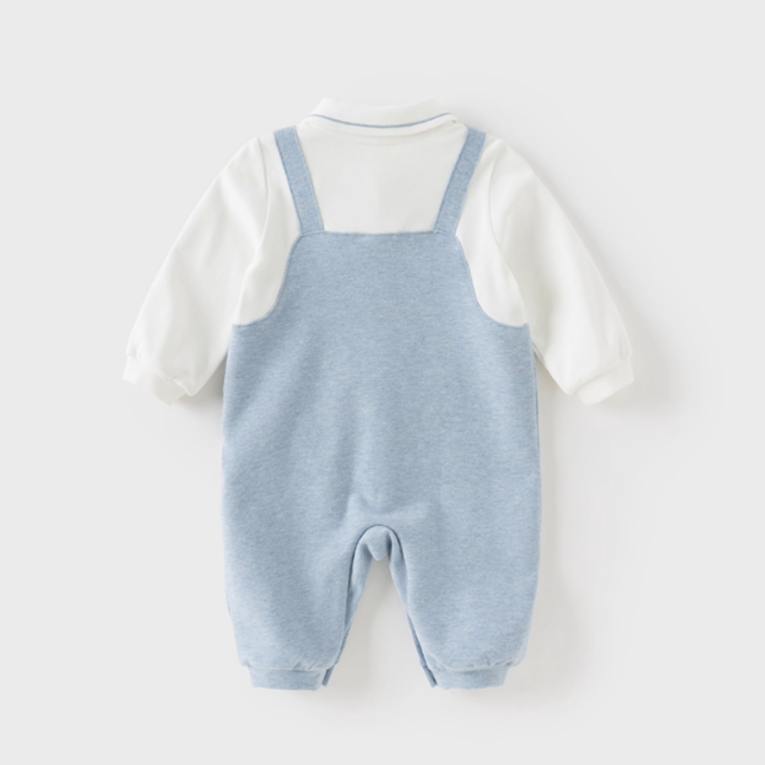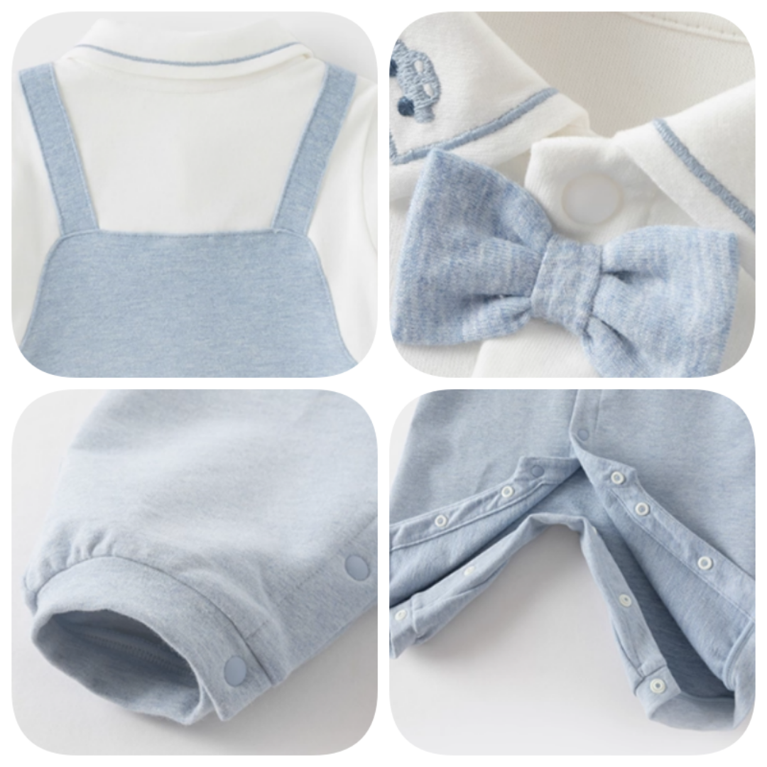 上品なライトブルーカラーが印象的な、シャツ×サロペット風のデザインロンパース♪