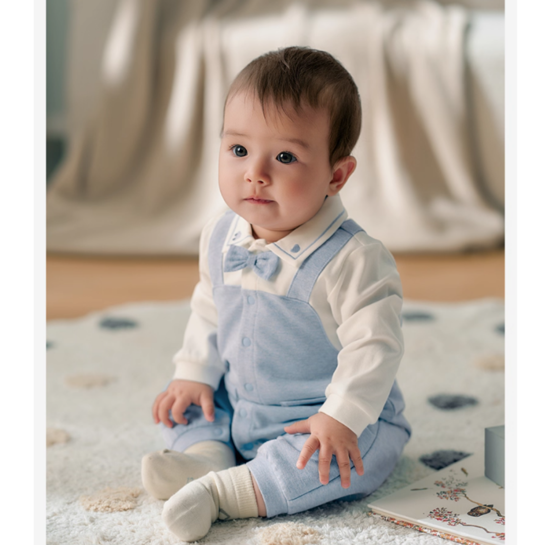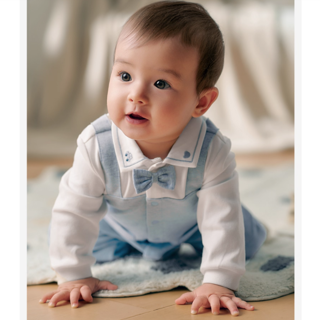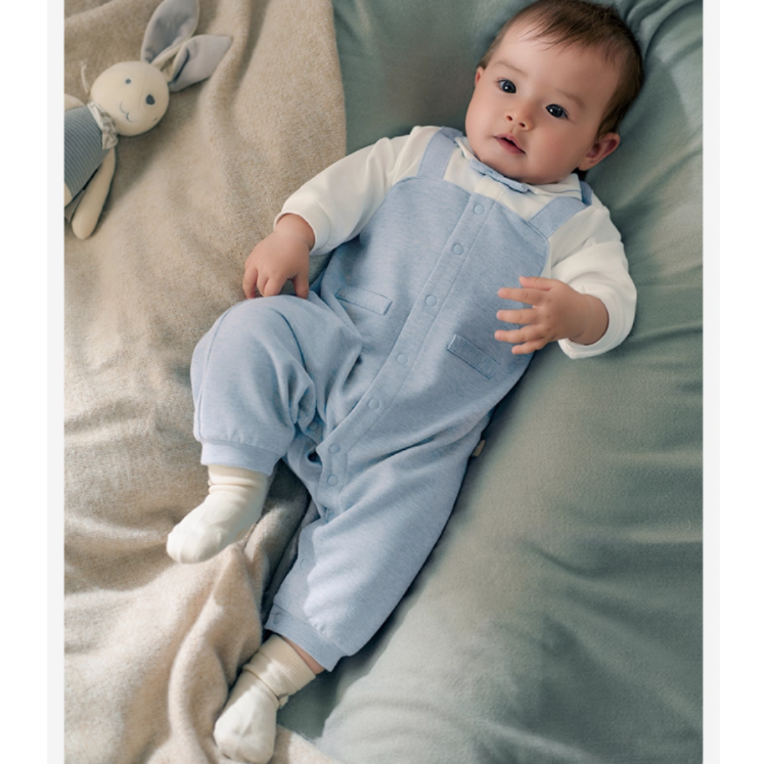 上品なライトブルーカラーが印象的な、シャツ×サロペット風のデザインロンパース♪