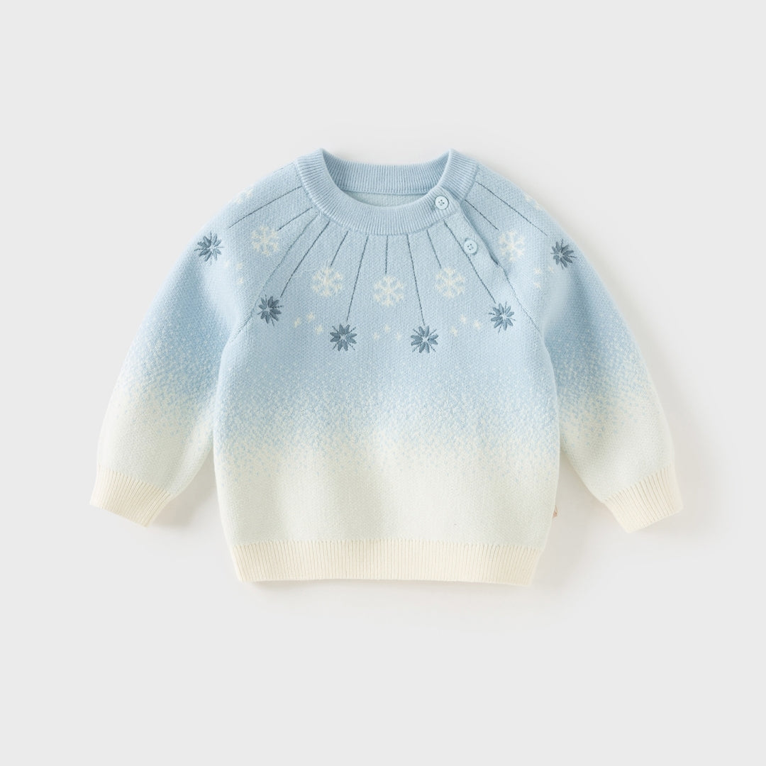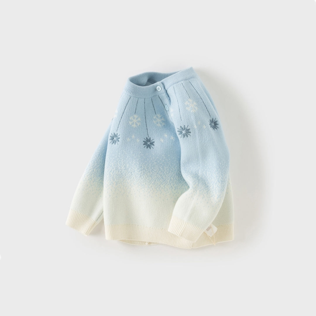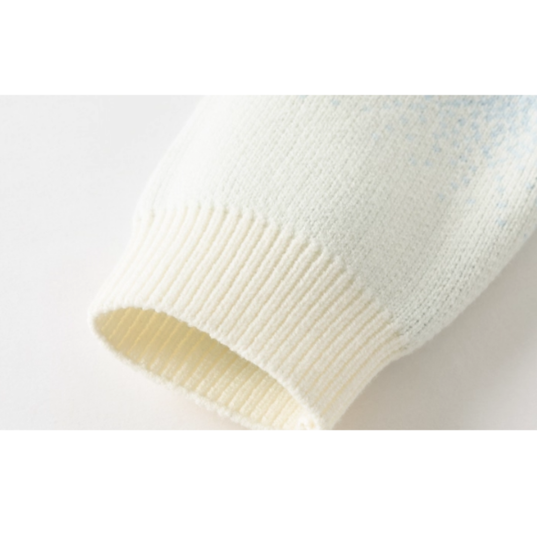 淡いブルーとホワイトのグラデーションが冬らしい、雪の結晶柄セーター。