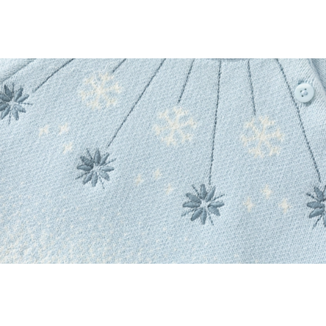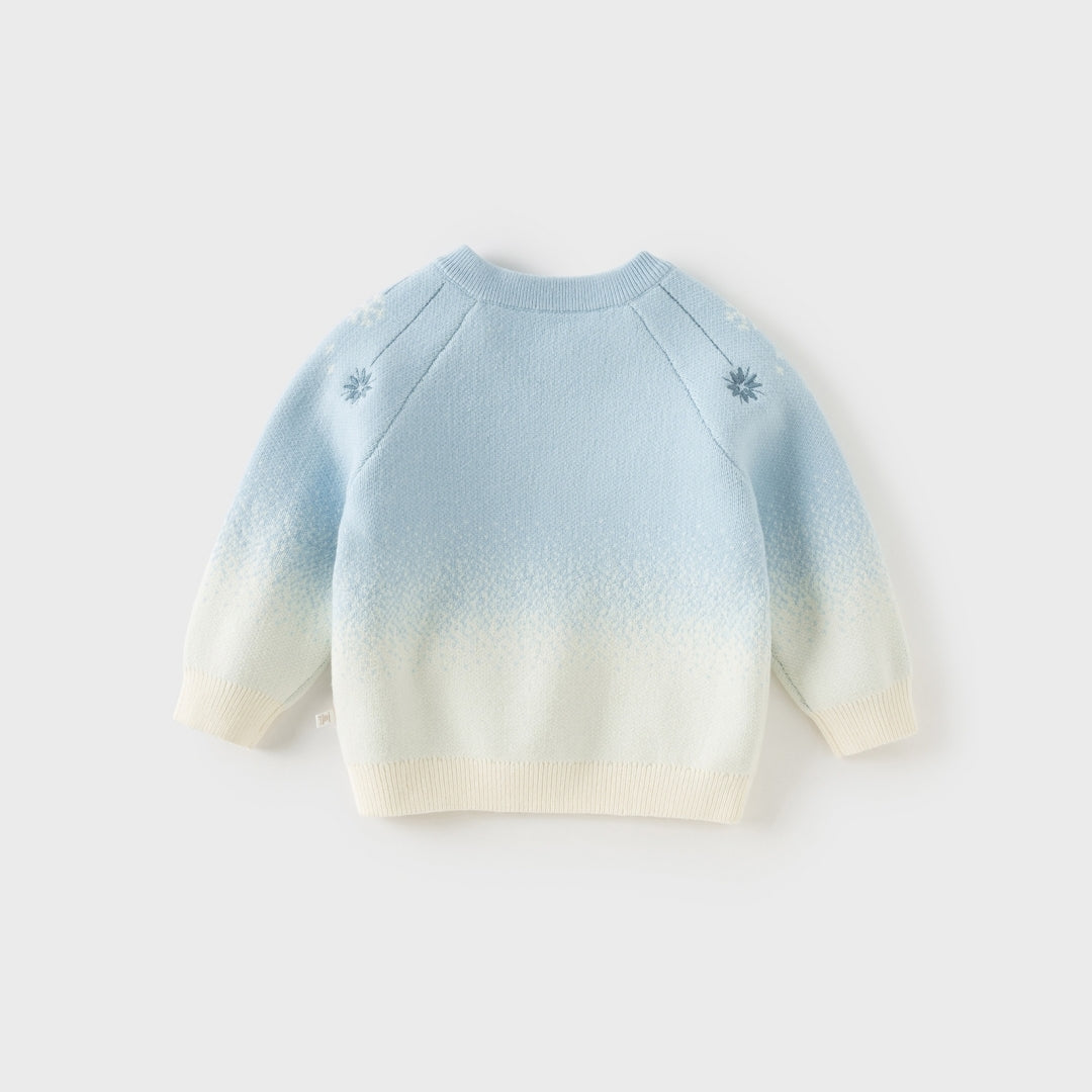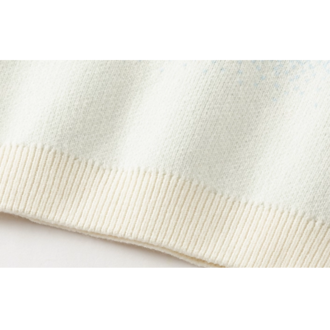 淡いブルーとホワイトのグラデーションが冬らしい、雪の結晶柄セーター。