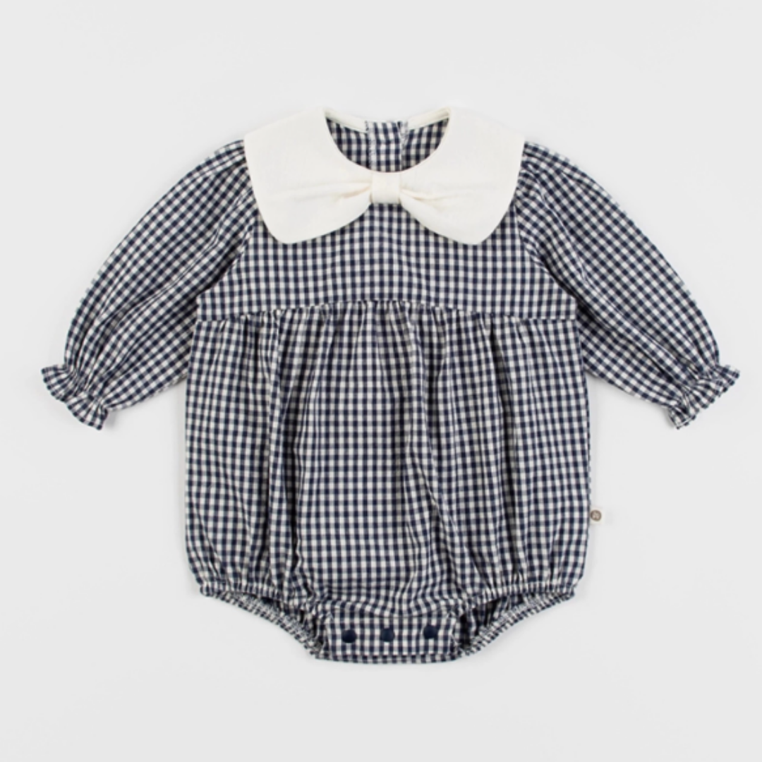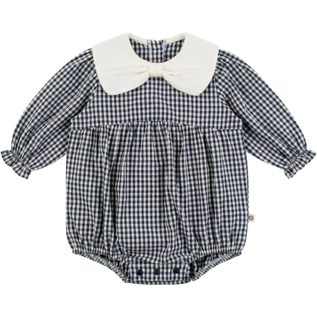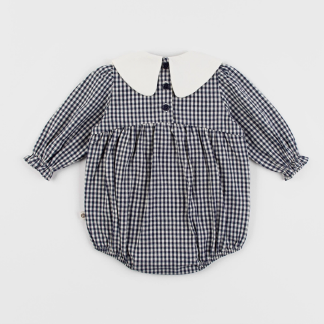 ネイビーのギンガムチェックが上品な印象のロンパース。
