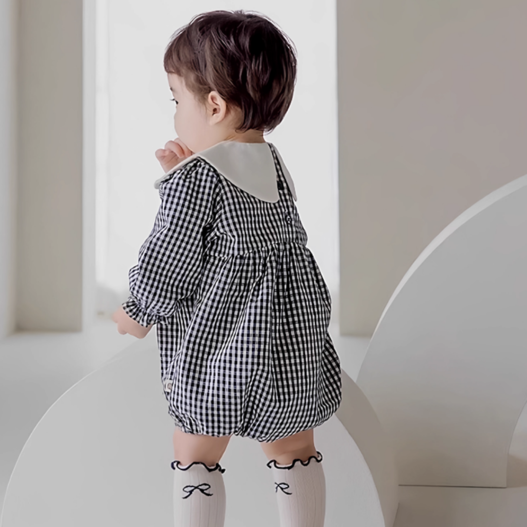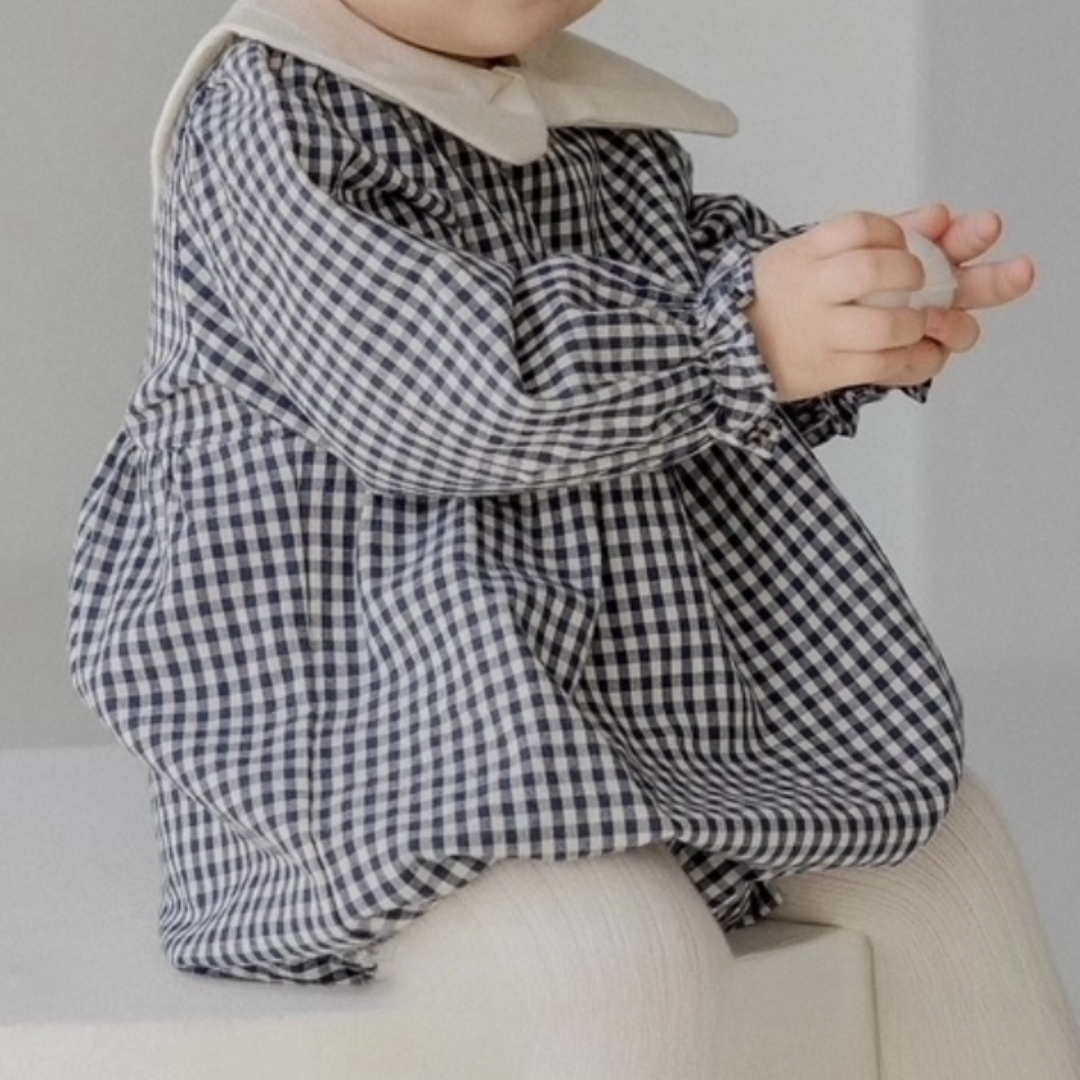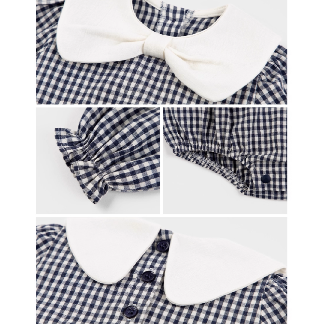 ネイビーのギンガムチェックが上品な印象のロンパース。