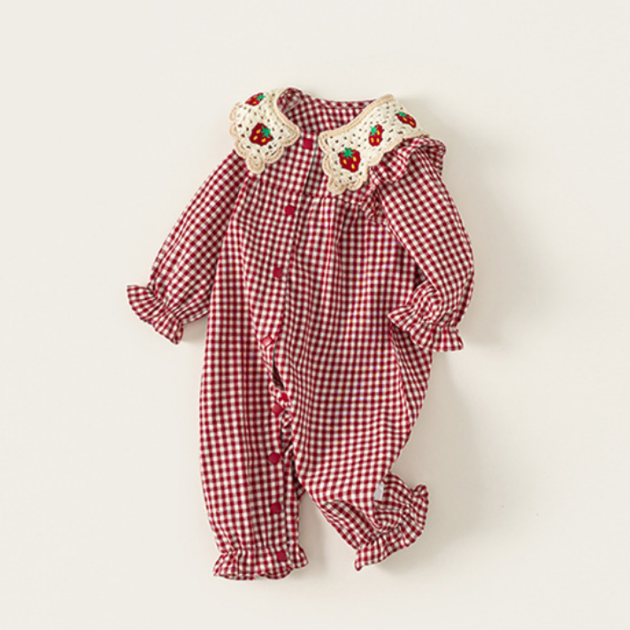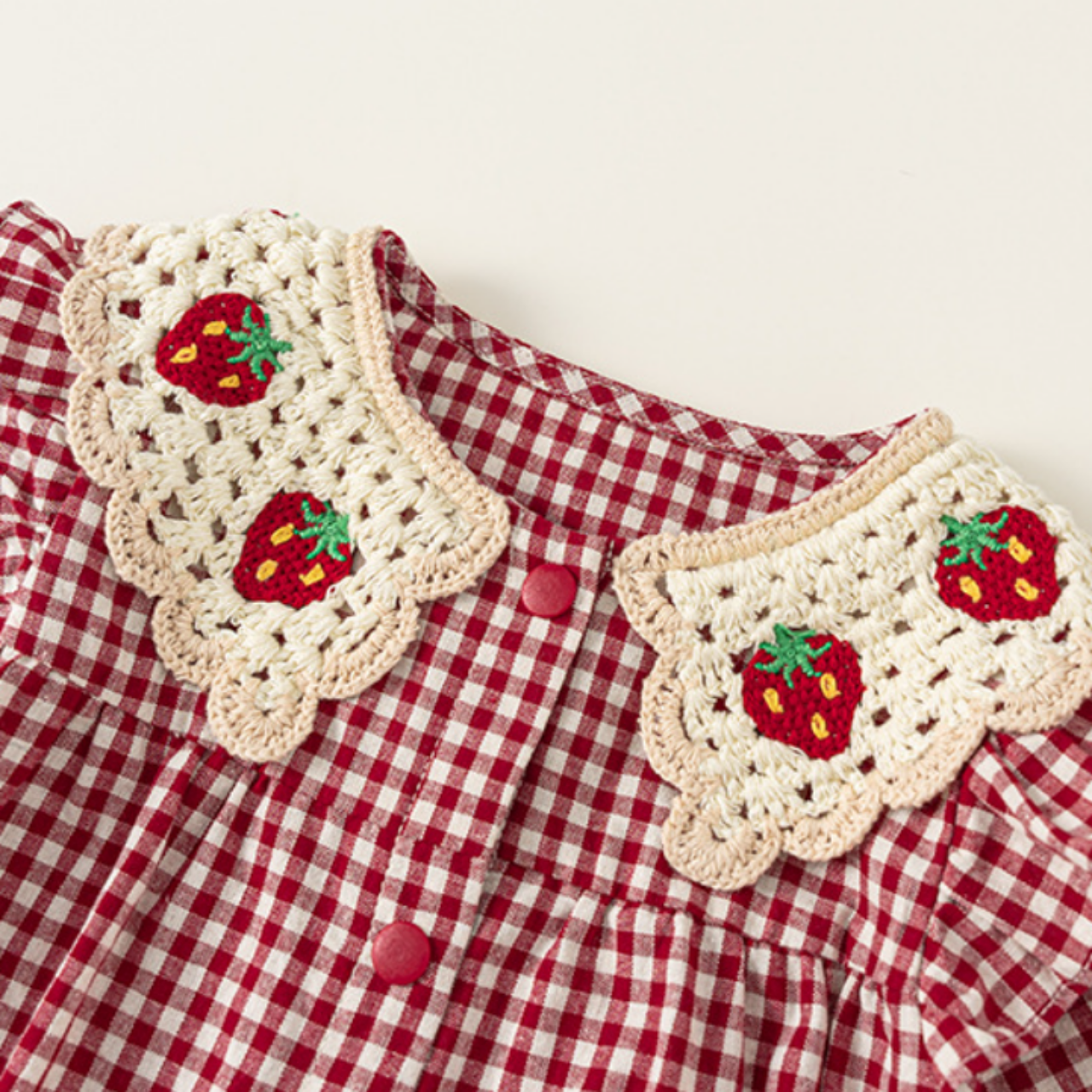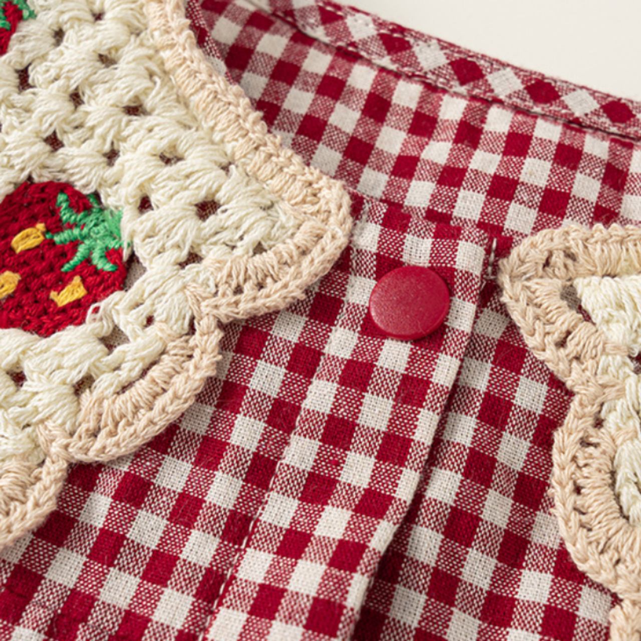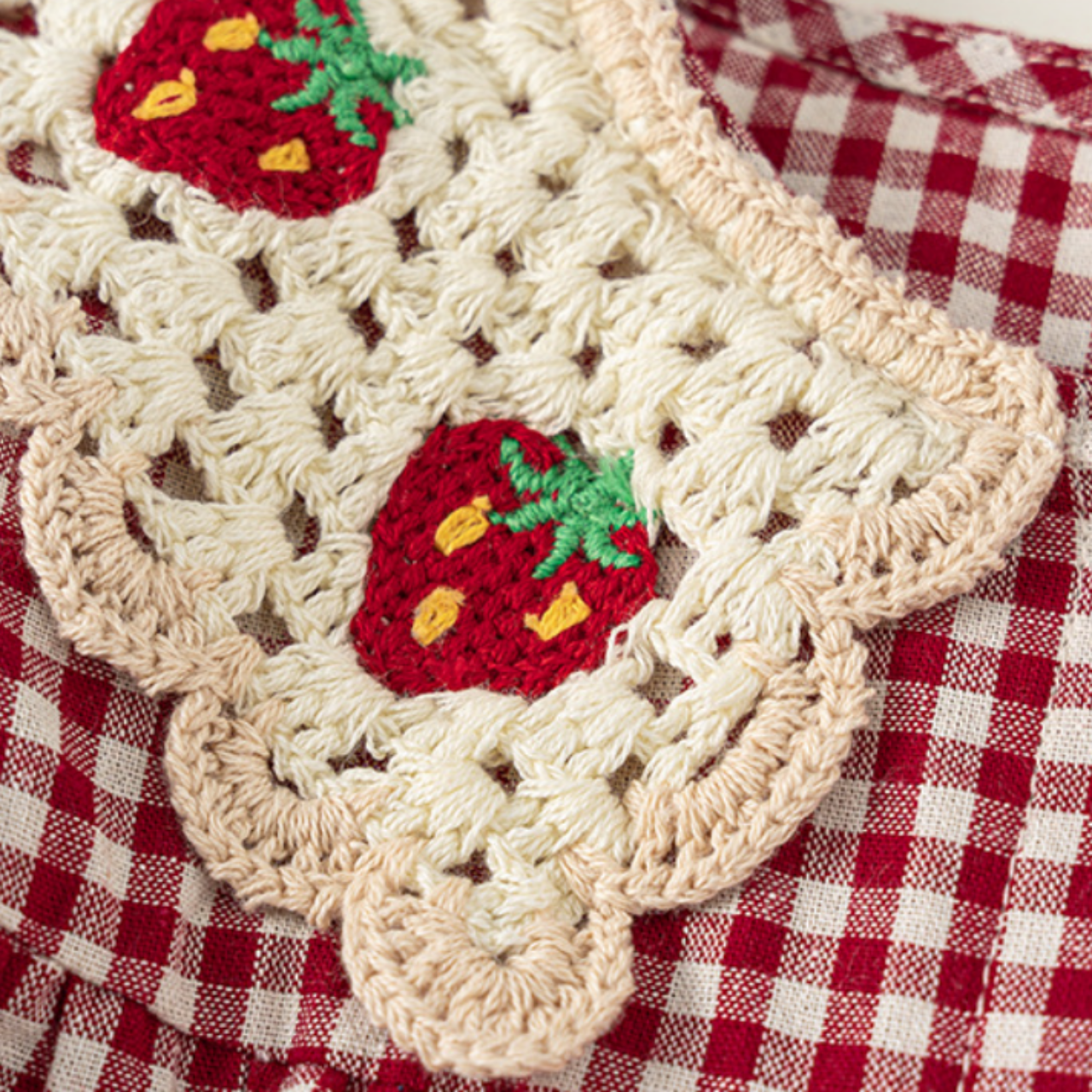 赤のギンガムチェックに、いちご柄のニット襟がかわいさをプラス♪