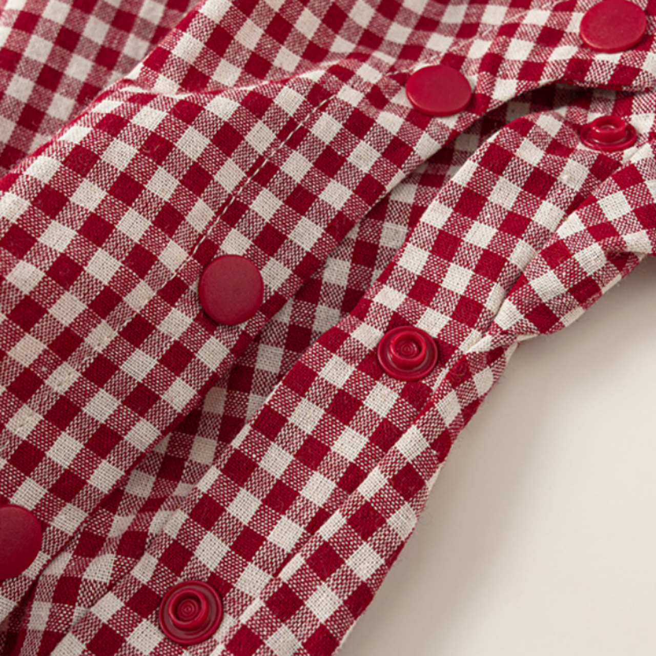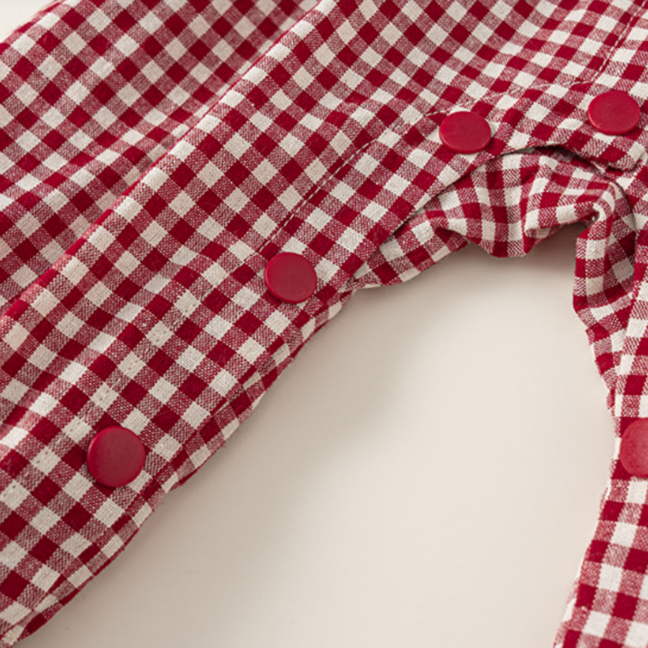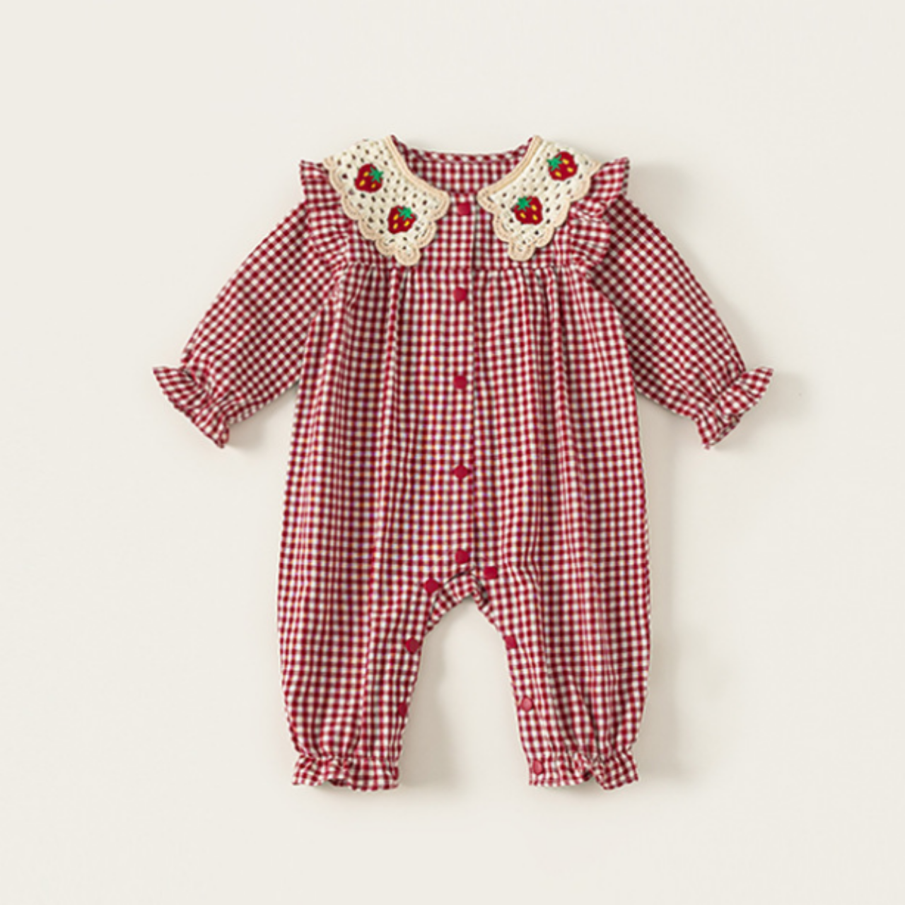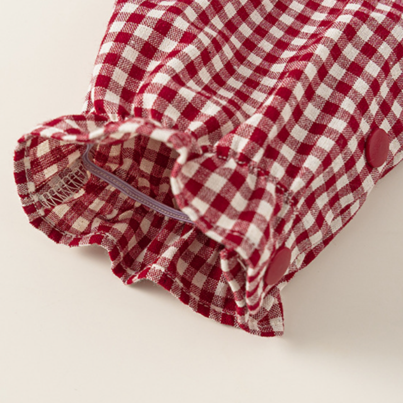赤のギンガムチェックに、いちご柄のニット襟がかわいさをプラス♪