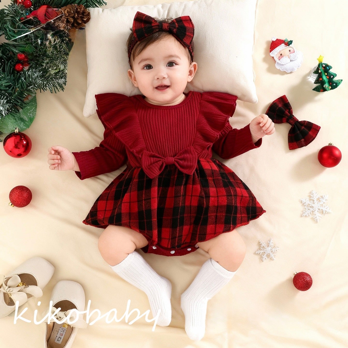 【ヘアバンド付き】レッドチェックロンパース70~100cm