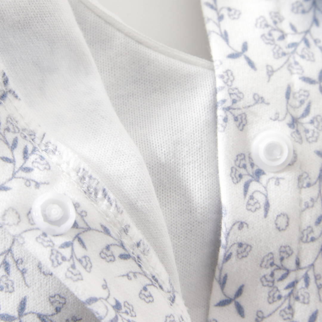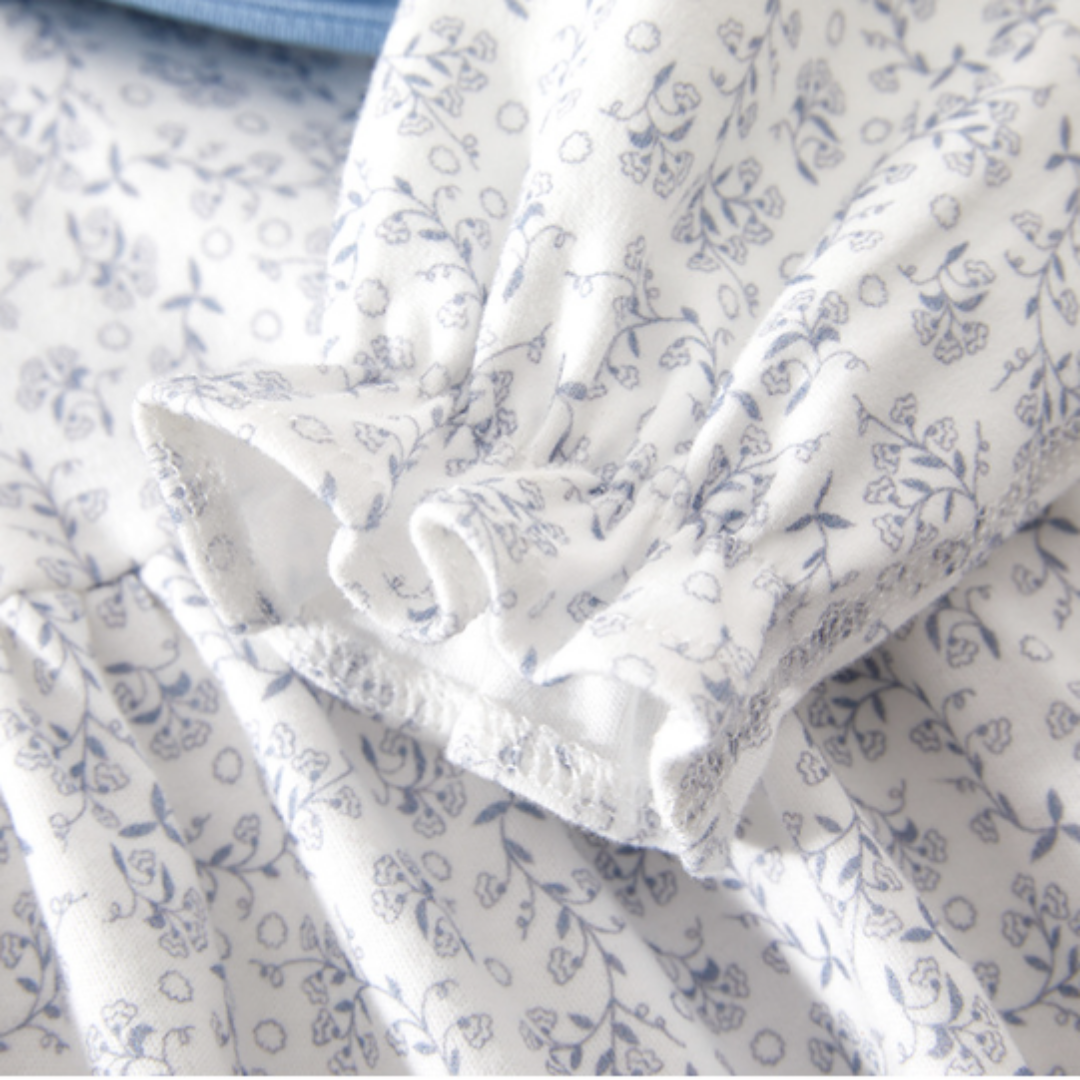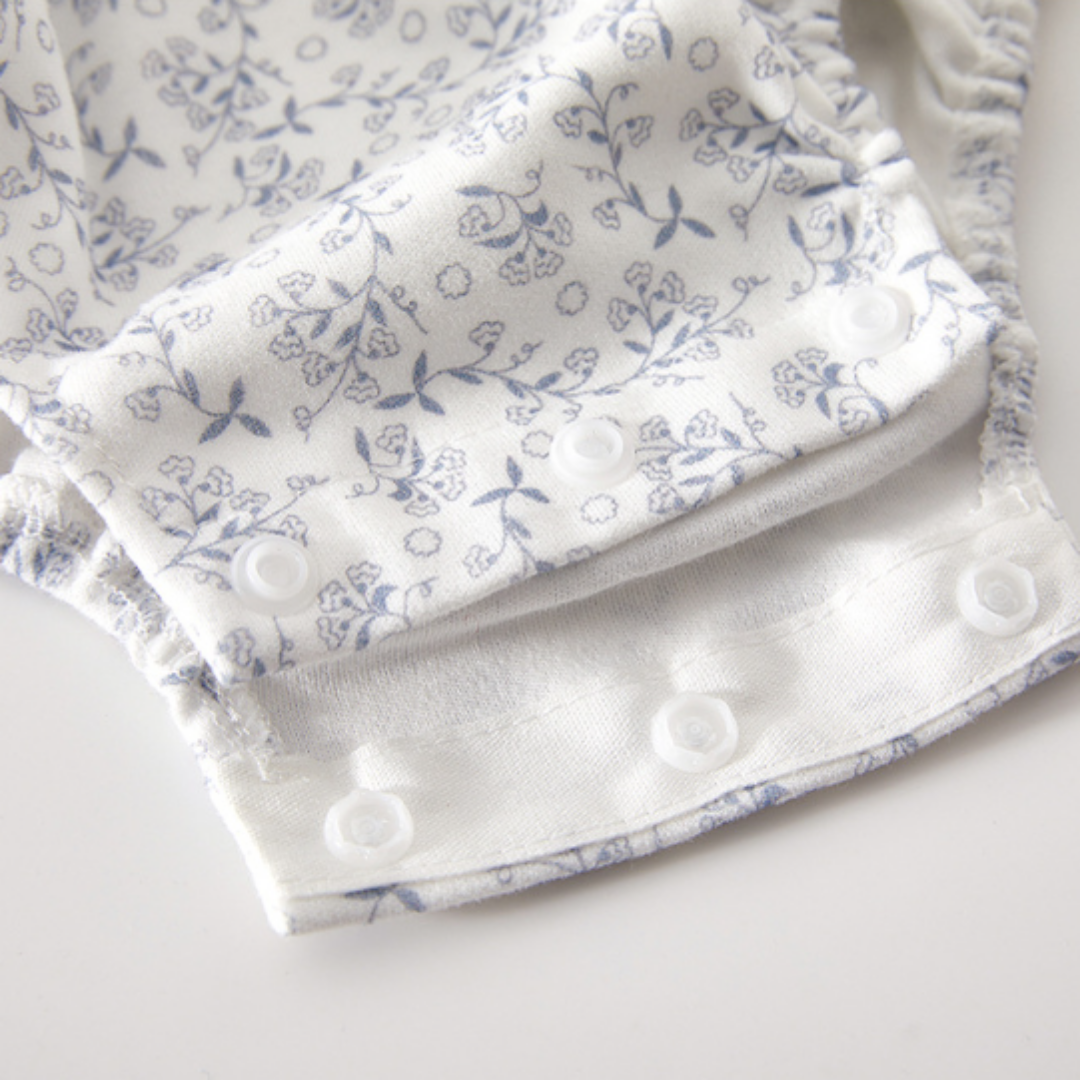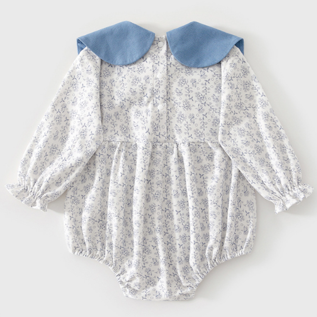 大きなリボンデザインの襟が目を引く、華やかで可愛らしいロンパース。